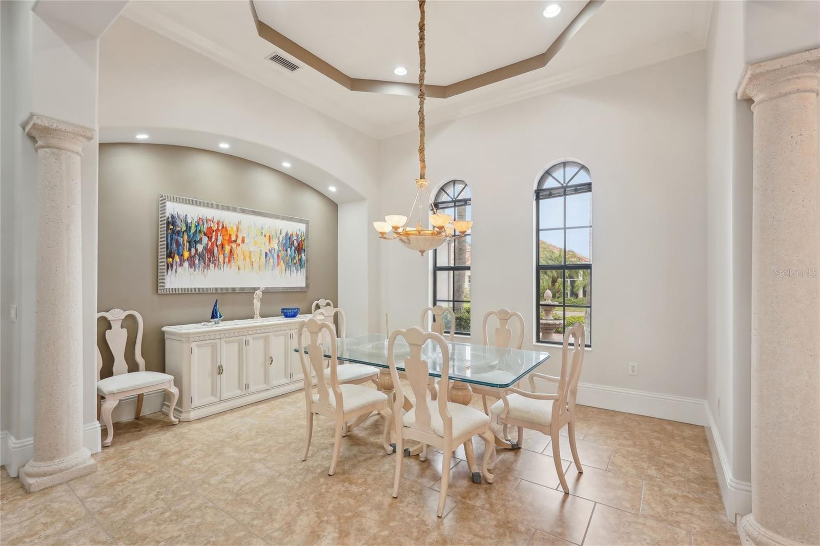 The dining room is garnished with a full wall arch, stone columns and an octagonal step ceiling. The gourmet kitchen is accessorized with a professional gas cooktop housing 6 burners, a grille and pot filler, convection oven, side by side refrigerator, wine refrigerator and stainless steel appliances.