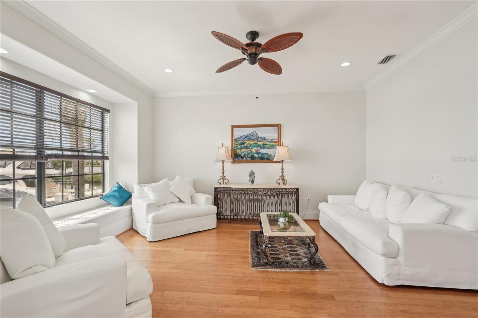 The primary suite offers a double step ceiling with recessed lighting, vestibule with art niche and custom tile, oversize walk-in closets and disappearing sliders with full lanai/harbor view. The primary bath features custom cabinetry and shelving, jacuzzi style tub with stone columns and walk-in shower with wall & oversized rainfall shower. With its double entry doors and built-in window seat, the french salon spills out to the veranda.