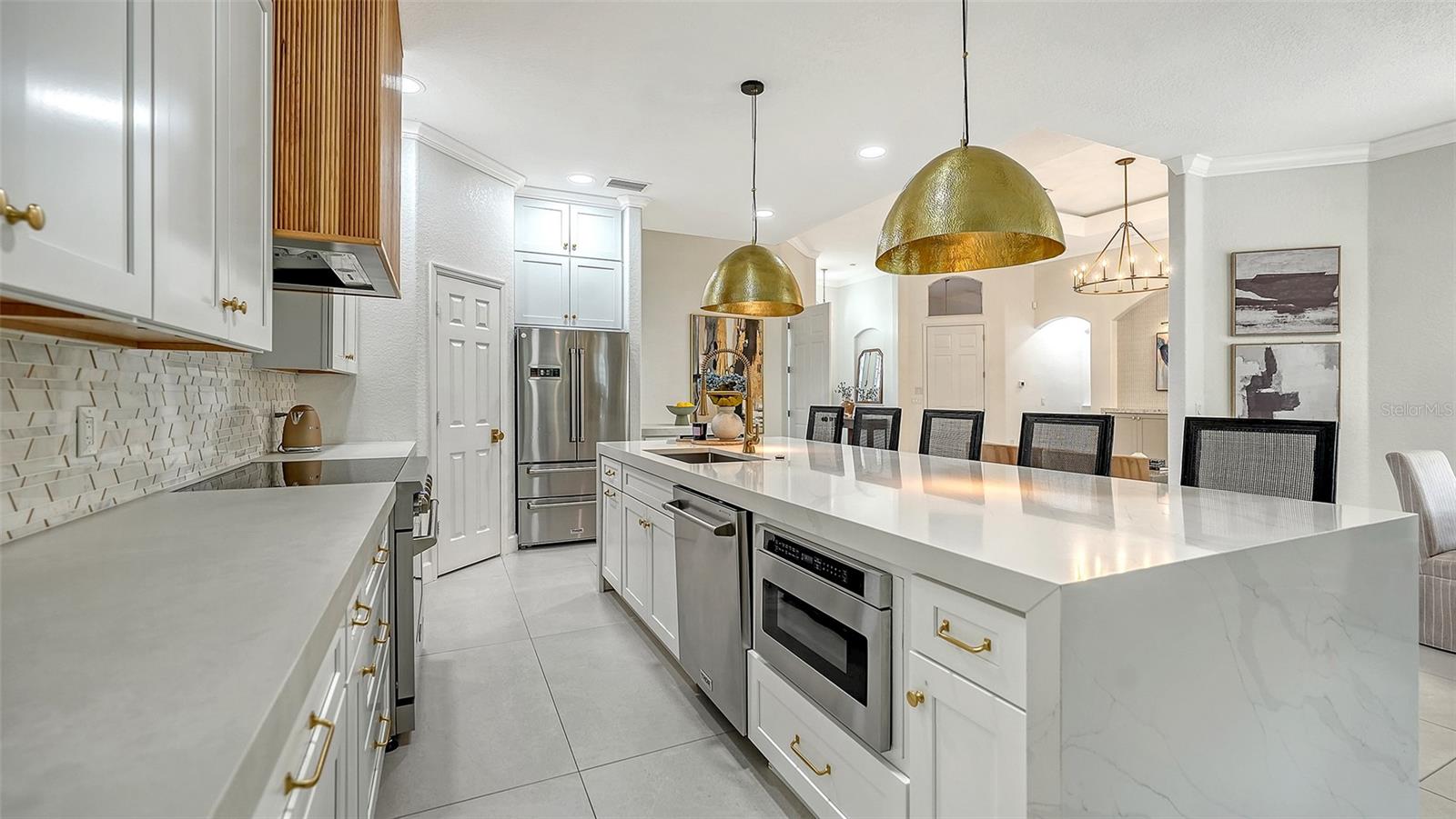 Chef’s kitchen: waterfall quartz island, THOR appliances, wine fridge, custom hood, marble herringbone backsplash