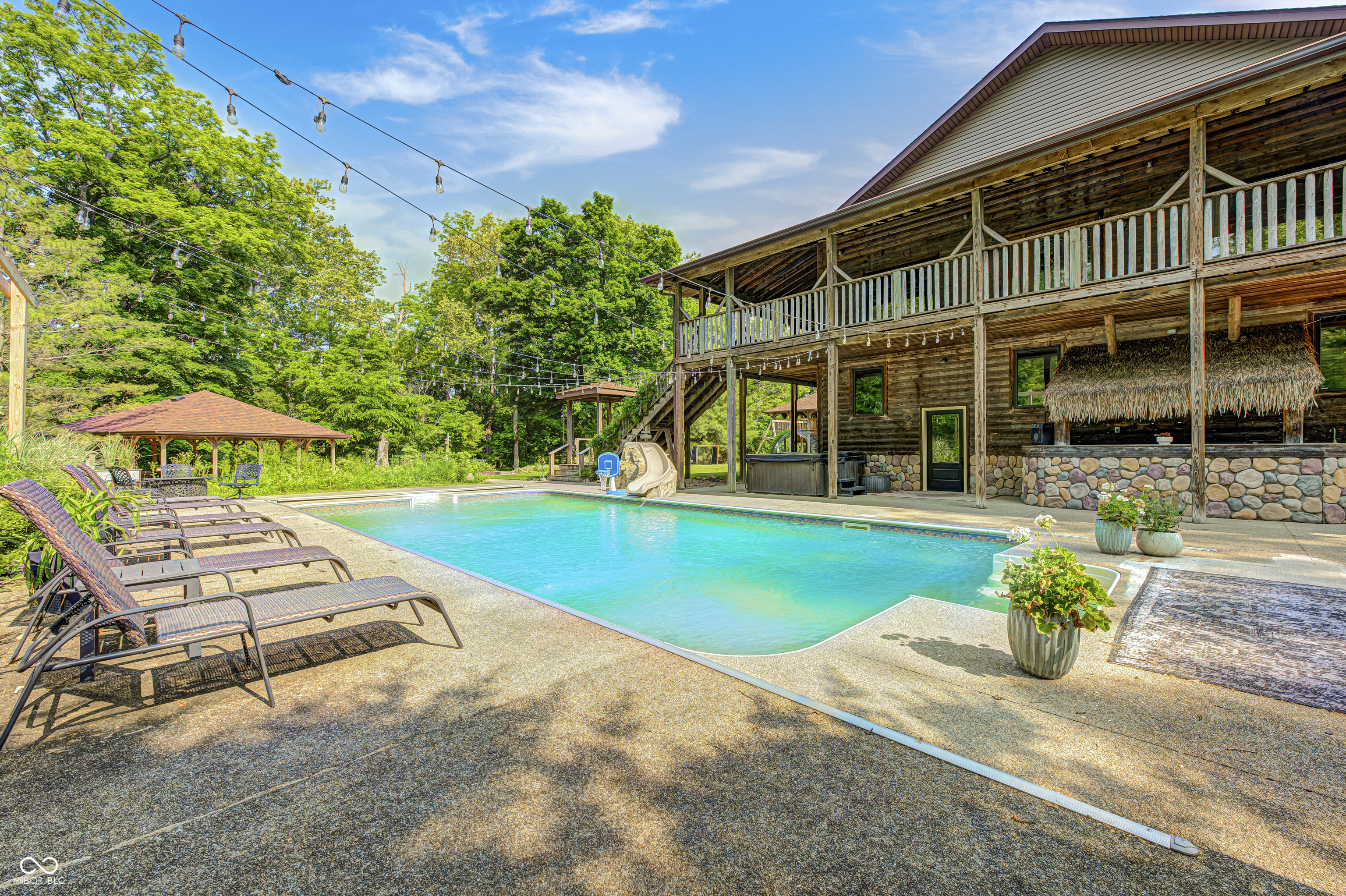 Don't miss this RARE opportunity to own your DREAM PROPERTY!! Sitting on very secluded 20 picturesque, wooded acres, this "retreat like" log home boasts over 10,000 SF, 9 bdrms, & 6 baths. The unique layout of 2 complete homes, on both the main and upper levels, offers endless options such as a "mother-in-law" suite, multi-generational living, retreat center, & so much more! Step into the main level w/ a cozy & warm log cabin feel, stone FP, HW floors, Primary bdrm, 2 addtl bdrms, 3 baths, laundry rm, & bonus room (could be office or sitting room). As you enter the upstairs, the soaring 11 ft ceilings are magnificent! The 2nd Primary Suite offers 2 WIC, a gorgeous en suite bath w/ Ceramic tiled shower and full soaking tub. Walk into the massive open concept space inc Great Room, Dining Rm & Modern Kitchen. Gourmet Kitchen boasts a large center island w/ brkfst bar, open shelving, quartz counters, & the most amazing walk in pantry (11x11)! Nature lovers will be in heaven with 20 acres of woods, gravel walking trails, Sugar Creek running through, stocked pond (w/ sep well), inground pool w/ auto cover, hot tub, 6,000 SF Barn w/ horse stall (electric/water), covered 23x23 Pergola w/ stamped concrete, chicken & duck coops, 24x24 custom covered playset & multiple other outbuildings. Heated attached garage offers 2- 12 ft doors, workshop, & a full attached Hair Salon Studio w/ separate entrance! 2nd Level wrap around covered porch extends around the entire home for many days/nights of peace and tranquility! Full semi-finished, waterproofed basement offers 2 workout rooms, cellar, plus 6 large storage rooms for unlimited possibilities! The entire home has been updated, please see supplements for complete list. This truly is a ONE OF A KIND property!