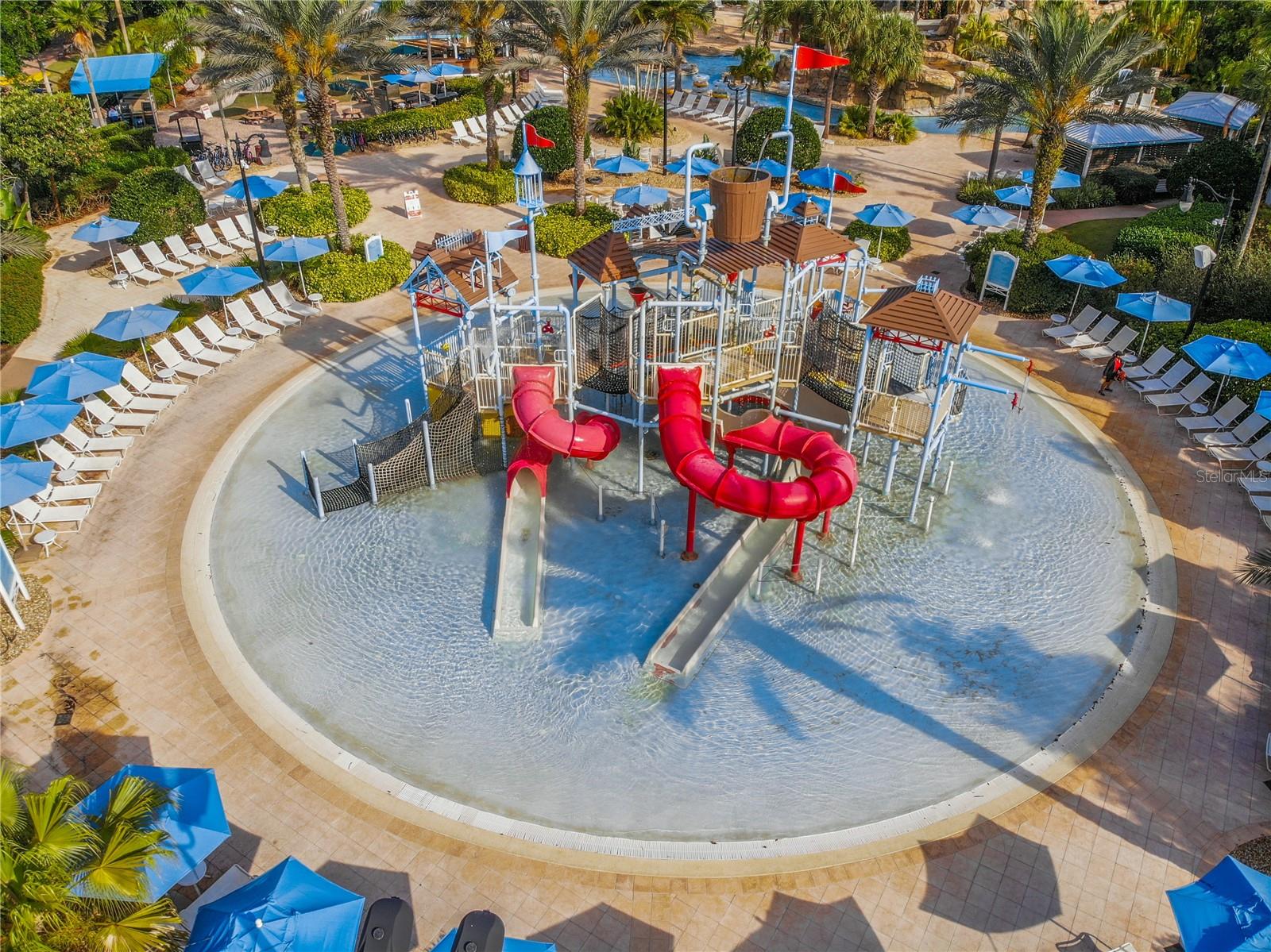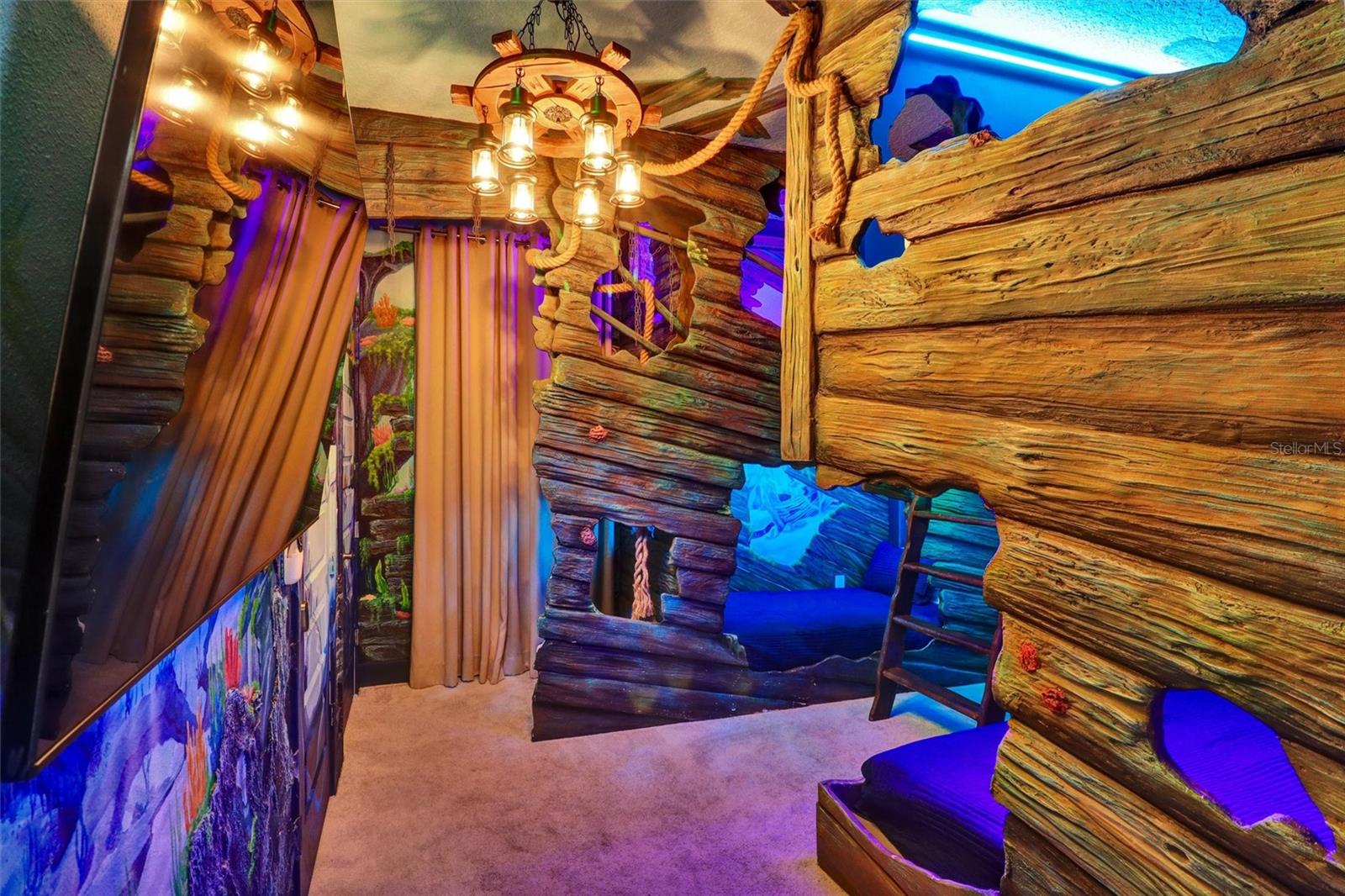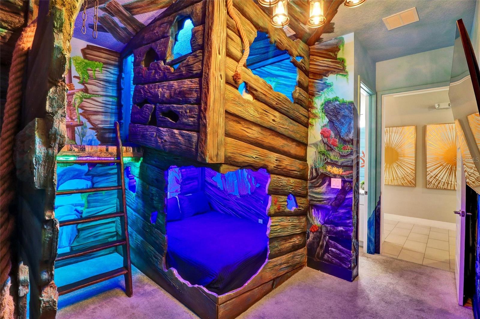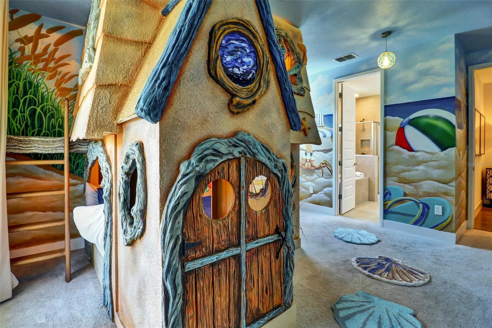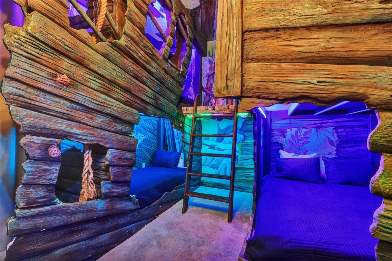 The chef’s kitchen is appointed with dual islands, stainless steel appliances including a gas cooktop and built in oven, custom cabinetry, ample storage, and bar top seating. Adjoining dining and living spaces are finished with tile flooring, soaring ceilings, and designer lighting. Upstairs, a full entertainment lounge includes a wet bar, pool table, and access to a covered balcony overlooking the park. Both first and second floor themed bunk bedrooms are designed to spark imagination, while all bedrooms are en suite and professionally designed with coordinated furnishings, blackout blinds, and ceiling fans.