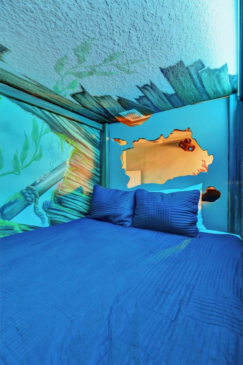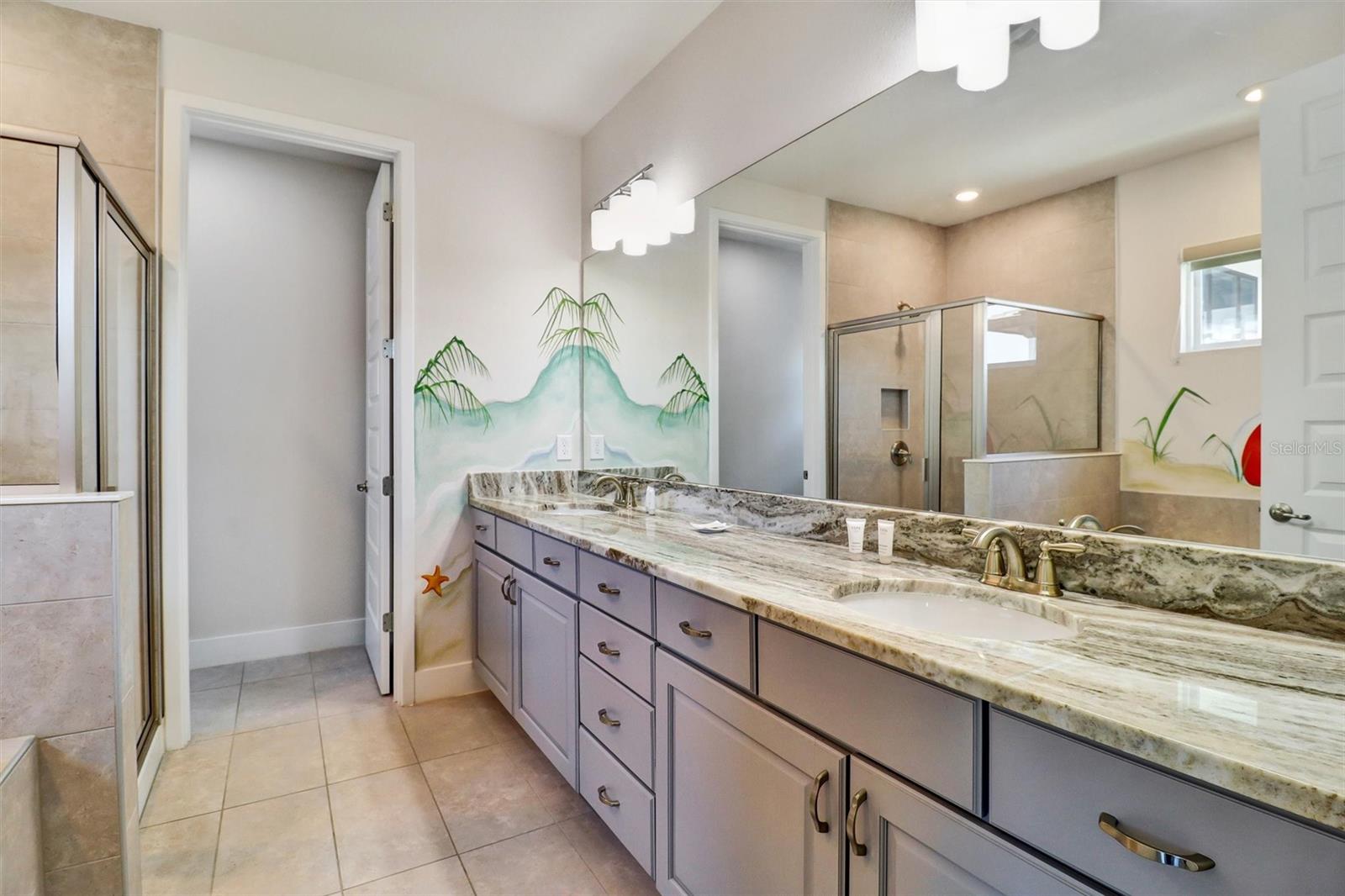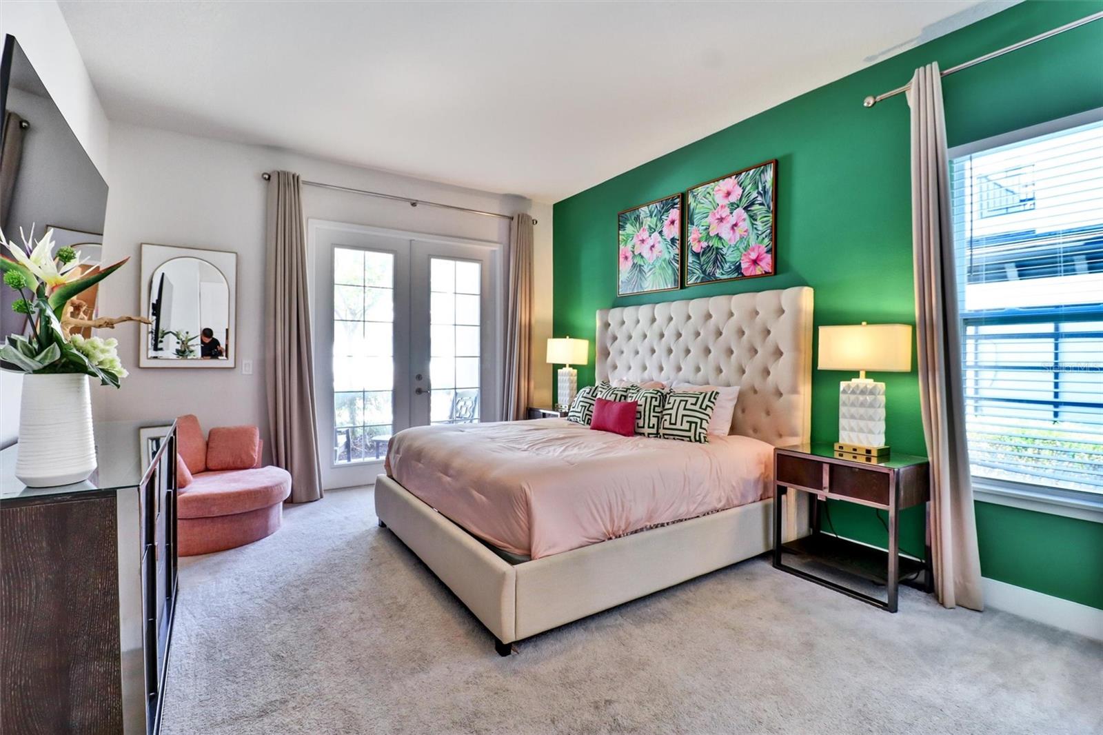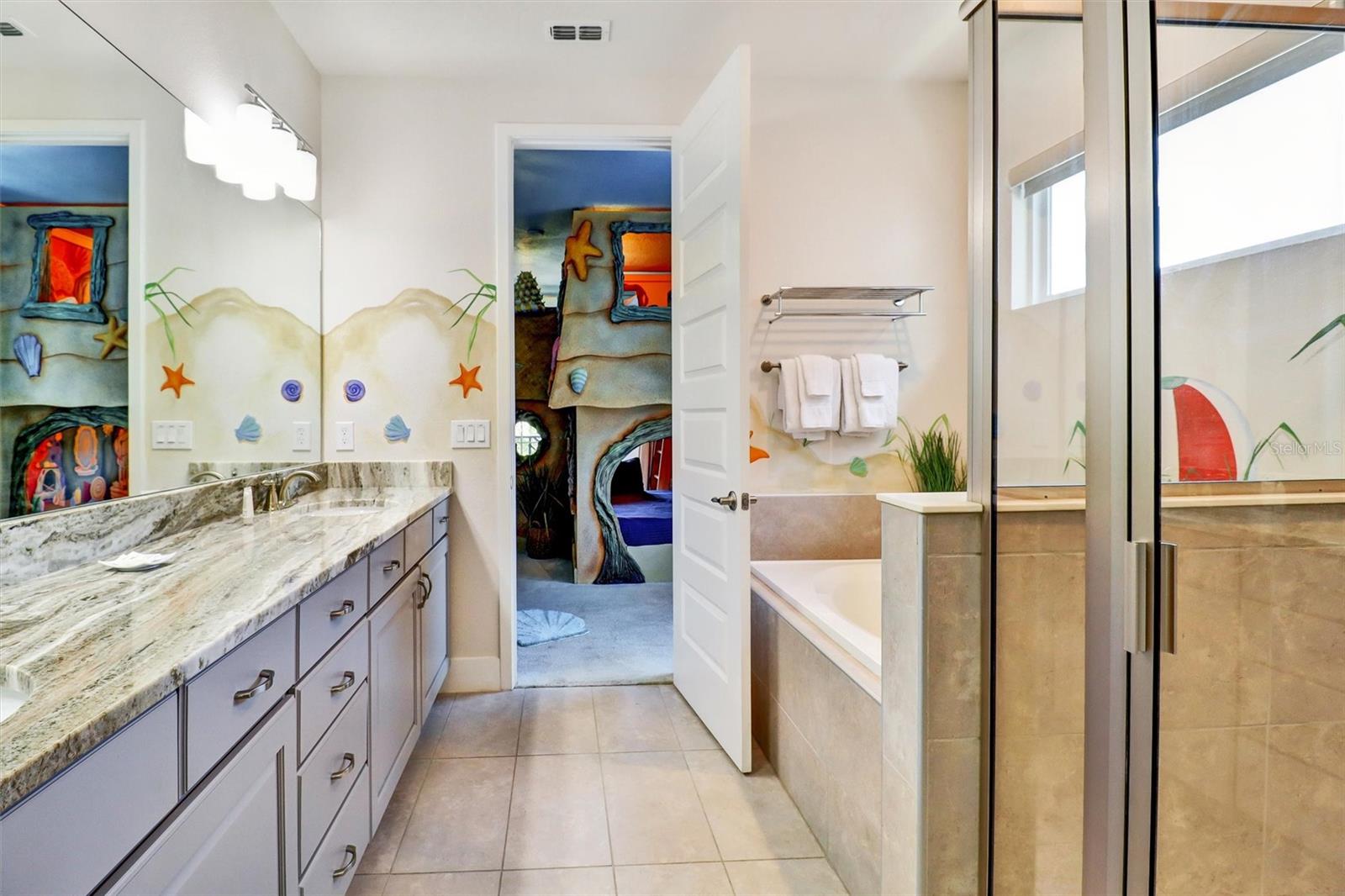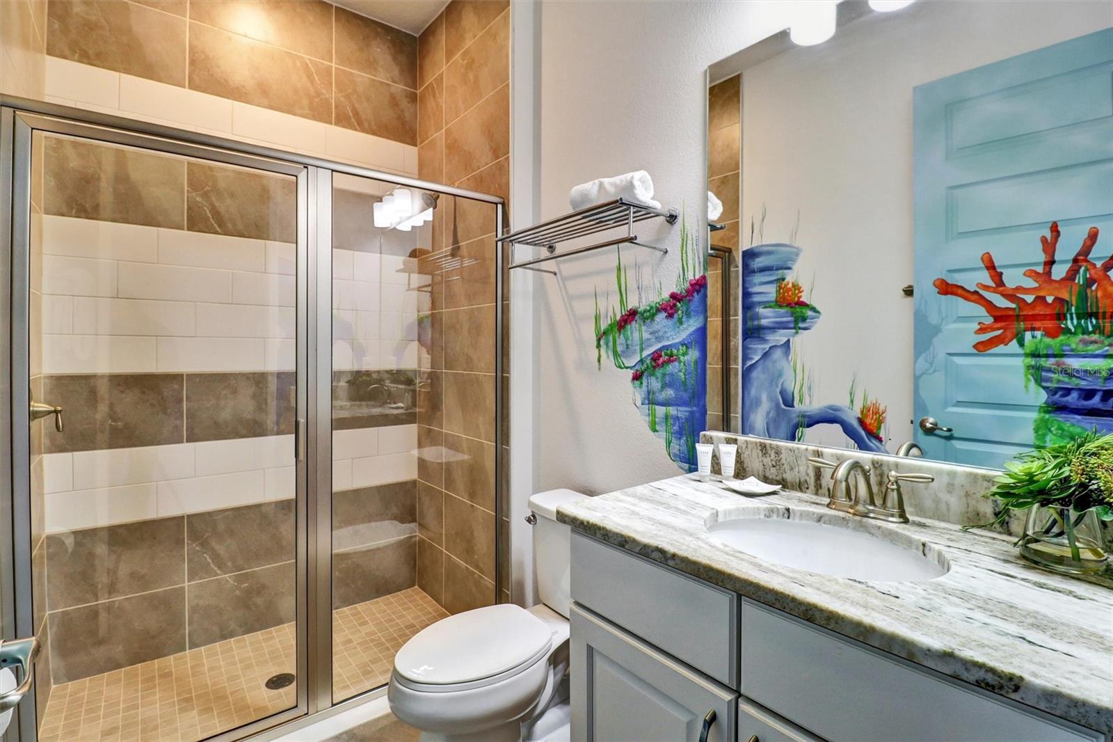 The chef’s kitchen is appointed with dual islands, stainless steel appliances including a gas cooktop and built in oven, custom cabinetry, ample storage, and bar top seating. Adjoining dining and living spaces are finished with tile flooring, soaring ceilings, and designer lighting. Upstairs, a full entertainment lounge includes a wet bar, pool table, and access to a covered balcony overlooking the park. Both first and second floor themed bunk bedrooms are designed to spark imagination, while all bedrooms are en suite and professionally designed with coordinated furnishings, blackout blinds, and ceiling fans.