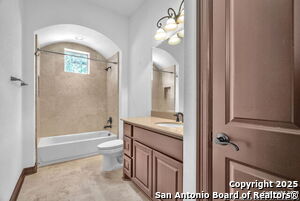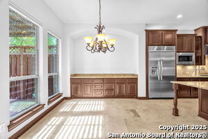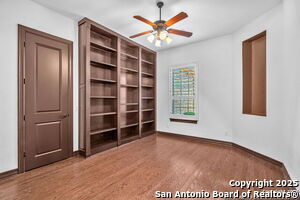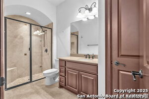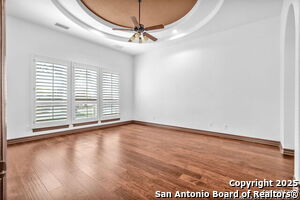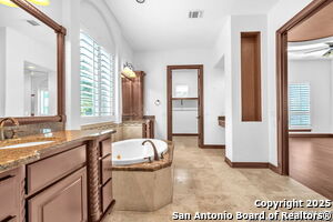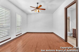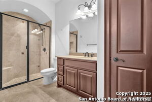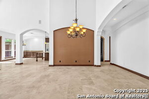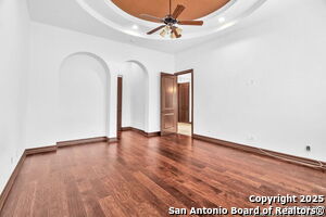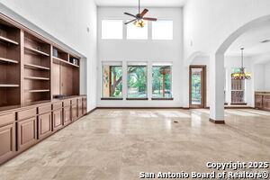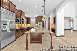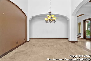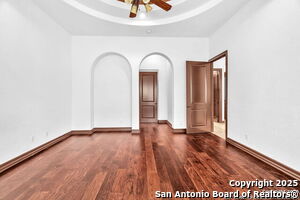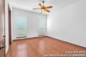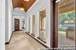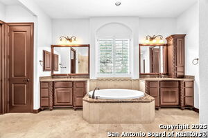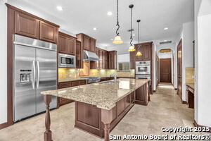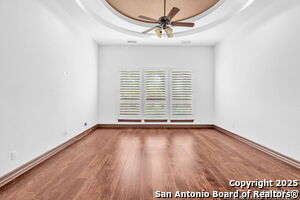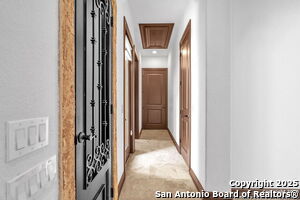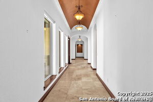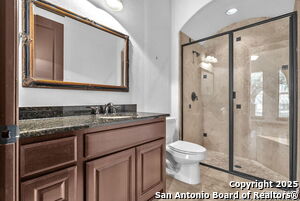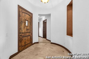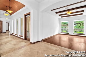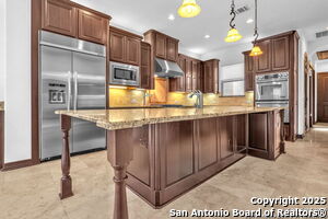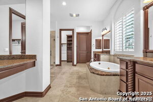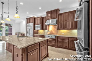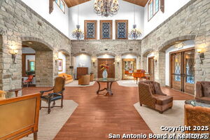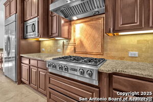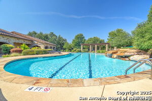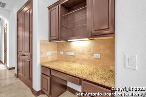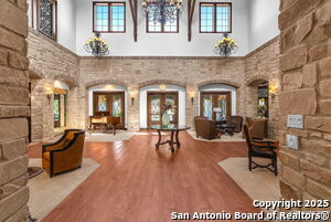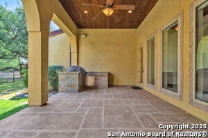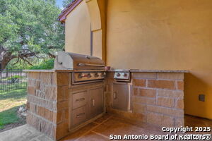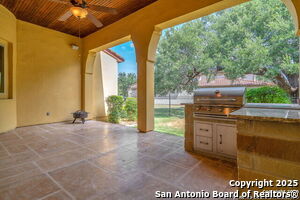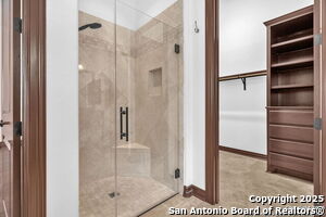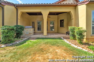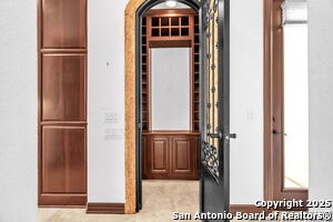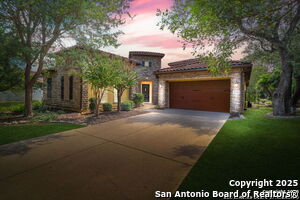 This beautiful Sitterle home, nestled in the master-planned, gated community of Cibolo Canyons' Campanas neighborhood, offers a 4 bedroom, 4 bath, 3765 sq ft living space. The meticulously detailed finish and exquisite craftsmanship captivate your senses, welcoming you to your new home. Move in ready! The barrel ceiling entryway leads to a thoughtfully designed floorplan, providing ample space for entertaining, welcoming family and friends, and living comfortably. Built-in cabinetry, travertine, and wood floors adorn the entire home, while granite counters, shutters in all bedrooms, large walk-in closets, and spacious bedrooms add to its charm. The kitchen is well-equipped with a gas range, pot filler, double ovens, a Kitchen Aid Built-in Refrigerator, two pantries, a built-in desk area, a large island, and a breakfast area with a built-in buffet. A wine pantry with a gorgeous iron scrolled door adds a sophisticated touch. The split floor plan allows for a private owner's suite featuring wood floors, recessed ceiling, and an on-suite primary bathroom with double vanities, travertine shower, tub, makeup vanity, and two large walk-in closets. The additional bedrooms are spacious and each has its own bathroom. One of the bedrooms could also be utilized as an office thanks to the built-in shelving and hall bathroom. The living room boasts large built in cabinetry, surround sound, high ceilings, and plenty of natural light from the large windows. A large flex space with a beam ceiling detail and wood floors can be transformed into an additional dining room, library, bar/lounge area, or fitness area. The backyard is fenced with gorgeous oak trees, a sprinkler system, and two separate patio areas. One of the patios includes cooking area with granite counter tops. HOA fees cover lawn and landscape maintenance, home security monitoring, and access to the resident Campanas Clubhouse, pool, library, game room area, gym, pickle ball/tennis courts, walking/jogging trails within neighborhood and more. Campanas residents also enjoy privileges at the Cibolo Canyons Amenity Centers, which include a lazy river, swimming pools, gym and spaces for social gatherings. The JW Marriott San Antonio Hill Country Resort and Spa is just a short drive away, with two PGA golf championship courses at TPC San Antonio. Located within minutes of schools, shopping centers, medical facilities, and more! Please verify room measurements and schools.
