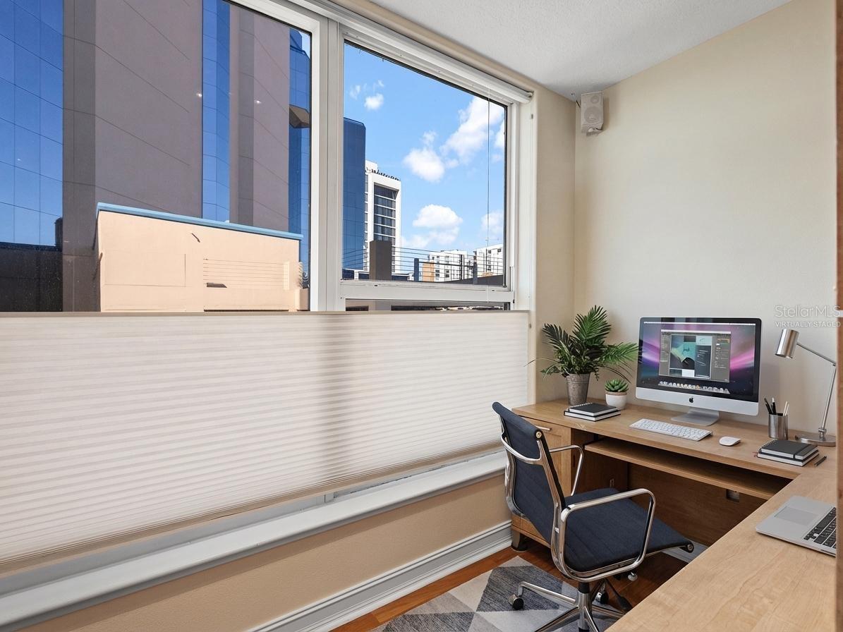 One or more photo(s) has been virtually staged. Welcome to Marina Tower, a waterfront residence located in the heart of downtown Sarasota. This beautifully appointed condo offers 1,940 square feet of thoughtfully designed living space, featuring two spacious bedrooms, two and a half bathrooms, and a versatile office nook ideal for working from home or quiet reading. Floor-to-ceiling glass sliders frame expansive views of Sarasota Bay, the marina, and the Gulf of Mexico, allowing natural light to fill the home throughout the day. The open layout flows seamlessly to a private balcony overlooking the water, creating a calm extension of the interior living space.