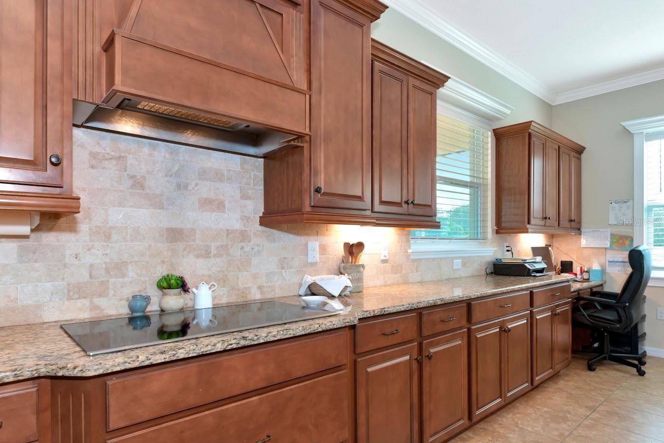 Inside, sunlight fills the open-concept interior, featuring a gourmet kitchen with granite countertops, desk area, pantry, and butler’s pantry. The kitchen flows seamlessly into the spacious great room and formal dining area. The main floor also includes a private office, guest suite with en-suite bath, powder room, laundry room, and extensive storage.