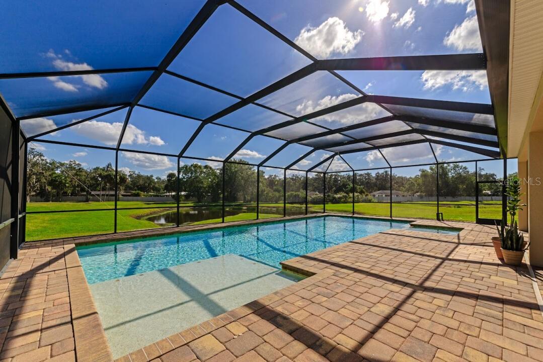 Enjoy the largest saltwater, solar-heated pool in the neighborhood (44' × 18'), perfectly oriented for all-day sunshine. The paver patio and covered lanai create an ideal setting for year-round outdoor dining, entertaining, and relaxation.
