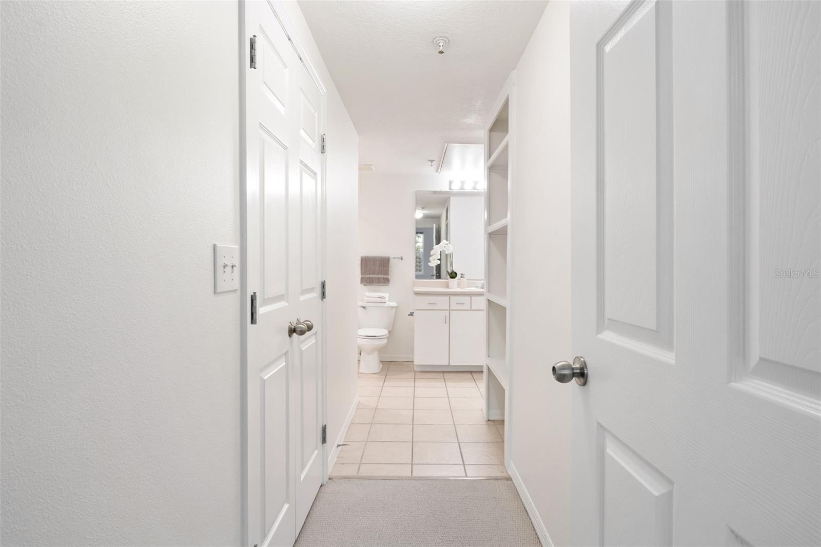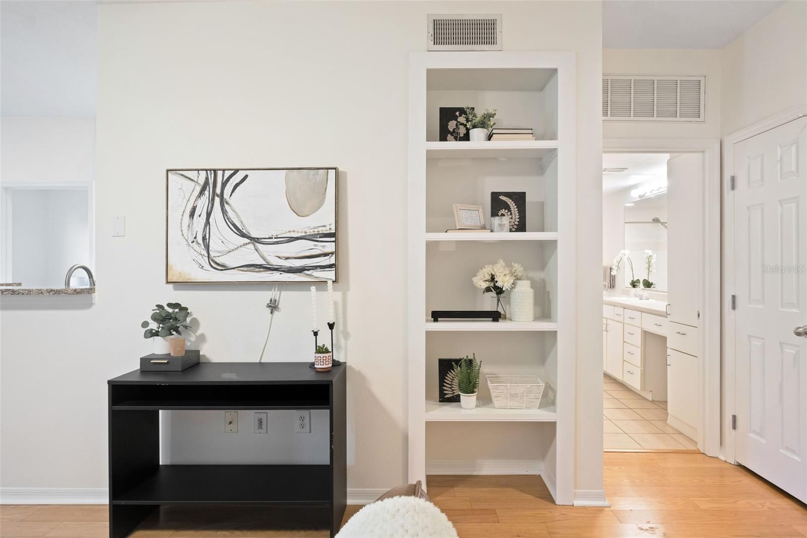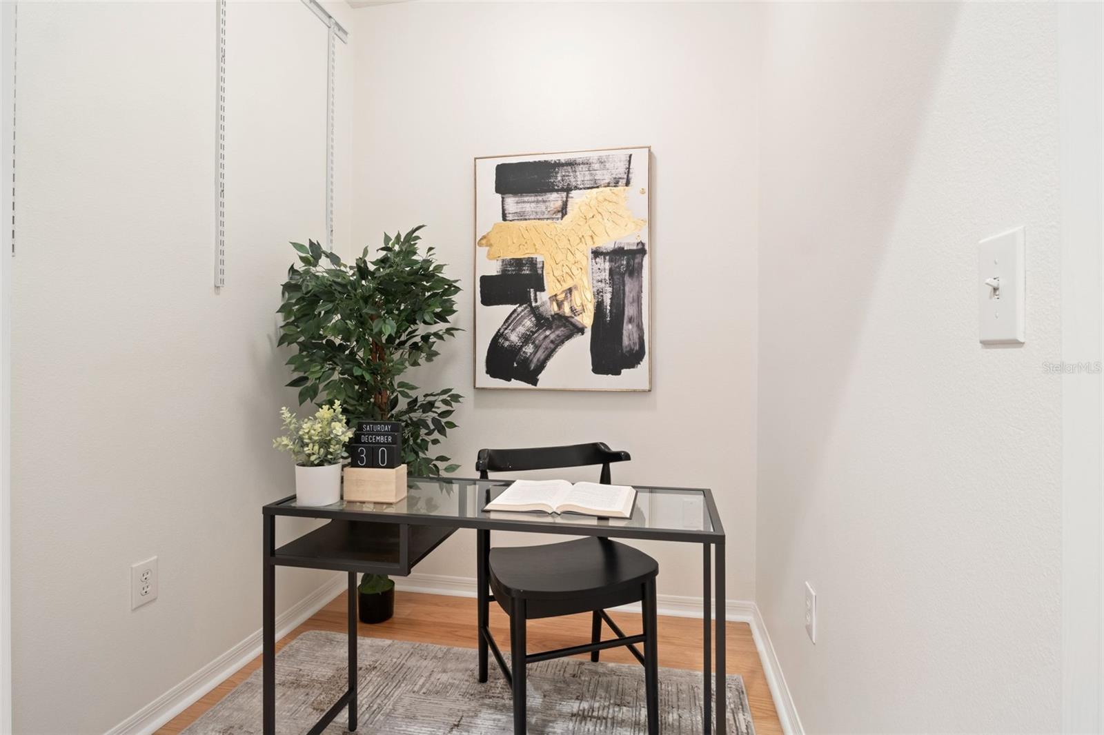 This thoughtfully designed unit features a large bedroom with a walk-in closet, a versatile bonus space (staged as a home office in the photos) that can also serve as an oversized closet, and a private balcony—perfect for relaxing or entertaining. Additional storage features include a coat closet, built-in shelving in the living room, and a pantry in the kitchen. The updated kitchen boasts granite countertops, stainless steel appliances, and modern cabinetry, seamlessly flowing into a bright, open living space. The bathroom offers a dual sink vanity and clean, neutral finishes for a fresh and inviting feel. Additional conveniences include an in-unit washer and dryer and an assigned covered parking space located near the unit.
