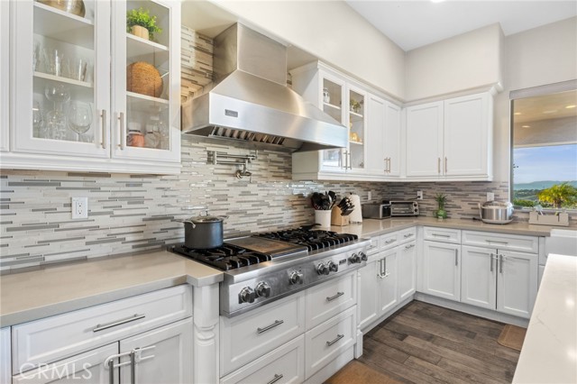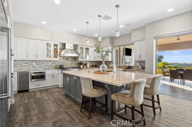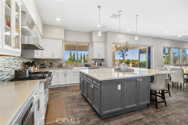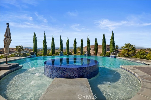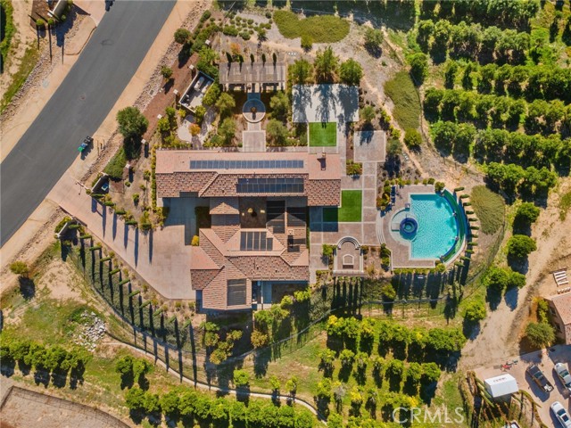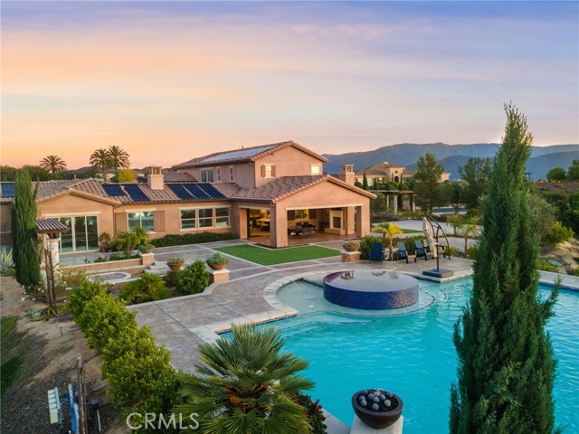 Set behind the prestigious gates of The Groves, this breathtaking 6-bedroom, 6.5-bath Tuscan-style estate embodies the perfect blend of timeless European elegance and modern Wine Country living. Located in the heart of Temecula Wine Country and surrounded by an active, certified organic citrus orchard, the 2.12 acre property offers uninterrupted vistas of rolling groves, vineyards, and glowing sunsets. Olive trees line the streets that lead to the residence, where rich architectural details and refined craftsmanship define every space. Inside, each bedroom enjoys the privacy of its own en suite bathroom, while the primary suite serves as a private retreat complete with a sitting area and a dedicated home gym. The gourmet kitchen features premium Viking appliances, complemented by a wine cellar, formal dining room, and multiple indoor/outdoor living areas ideal for entertaining. An airy atrium brings soft natural light into the home’s core, enhancing its warm, inviting ambiance. Luxury and convenience come standard with paid solar, a whole-home generator, solar pool heater, water softener, reverse-osmosis drinking system, under-counter ice maker, under-counter freezer, custom shutters/blinds, and ceiling fans throughout. The resort-style backyard showcases a sparkling pool and spa, framed by panoramic views of citrus orchards and stunning sunset views. A private casita provides flexible space for guests or multigenerational living. Car enthusiasts will appreciate the expansive 5-car garage, offering ample room for vehicles, storage, or a workshop. Blending Tuscan character with modern sophistication, this exceptional estate captures the essence of luxury Wine Country living within one of Temecula’s most coveted gated communities.