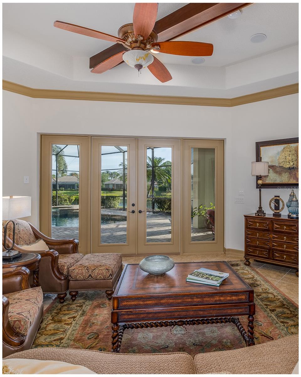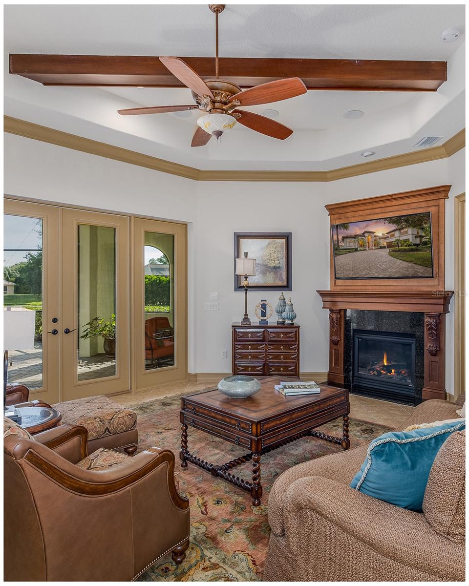 Welcome to an Extraordinary Lifestyle — Floresta at Champions Club. Nestled behind the exclusive gates of Floresta within the prestigious Champions Club golf course community, this impeccably maintained original-owner residence is a rare offering that seamlessly blends refined elegance with effortless everyday living. From the moment you arrive, the attention to detail is unmistakable. Soaring tray ceilings adorned with rich crown molding and intricate wood details set the tone in both the formal living and dining rooms, where elegant window treatments frame every vista with grace. This is a home that was built to impress — and has only grown more distinguished with time. The custom chef’s kitchen is a true culinary sanctuary, appointed with rich wood cabinetry, gleaming countertops, and a show-stopping custom hood. A sun drenched breakfast nook invites you to start your mornings with serene views of the shimmering pool and tranquil pond beyond. The heart of the home - the family room - is warm and inviting, anchored by a gas fireplace, dramatic wood beam ceilings, and atrium doors that blur the line between indoor and outdoor living, opening directly to your private outdoor haven. Retreat to the oversized primary suite, where a generous sitting area and spa-inspired en suite bath await. His-and-her vanities, a luxurious soaking tub, and a custom shower create a daily escape from the ordinary. Two additional oversized first-floor bedrooms share a well-appointed bath, while the media room / home theatre delivers the ultimate cinematic experience without ever leaving home. A dedicated pool bath services both the movie room and the outdoor living area with ease. Rounding out the first floor: a stylish half bath, a fully equipped laundry room, and a practical drop zone.