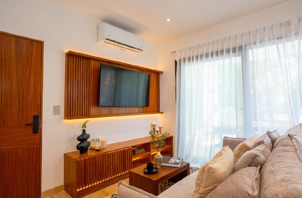 Discover elevated living in this stunning 2-bedroom, 2-bathroom condo located in Baikal inside the prestigious Tulum Country Club. Designed with a seamless open-concept layout, this elegant residence features a spacious kitchen, dining and living area that flows into your private Jacuzzi and balcony overlooking the golf course, creating a serene backdrop for both relaxation and entertaining. Wake up surrounded by tropical beauty, soak in the sun on your balcony, and enjoy the privacy and tranquility that come with luxury resort-style living. Residents enjoy an exceptional collection of amenities, including pools, outdoor fireplaces, sky lounges, a fully equipped gym, co-working spaces, and more. Whether you're seeking a serene retreat, a stylish full-time residence, or a high-performing investment in one of the Riviera Maya’s most sought-after gated communities, this condo offers the perfect blend of natural elegance, upscale comfort, and the vibrant Tulum Beach just minutes away.
