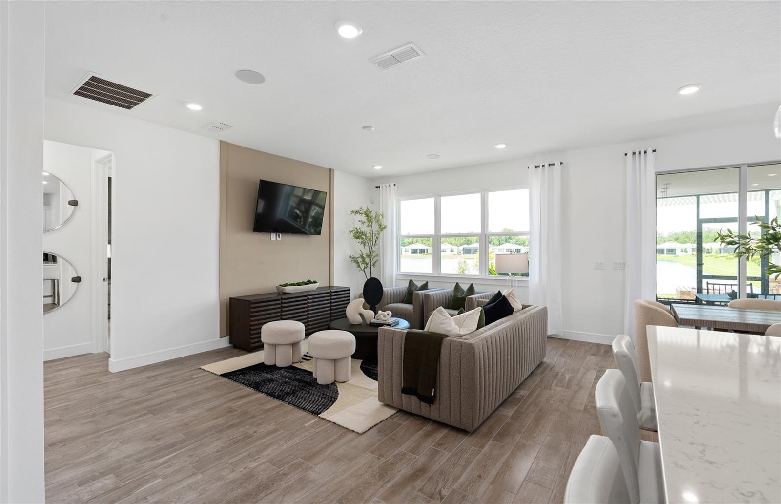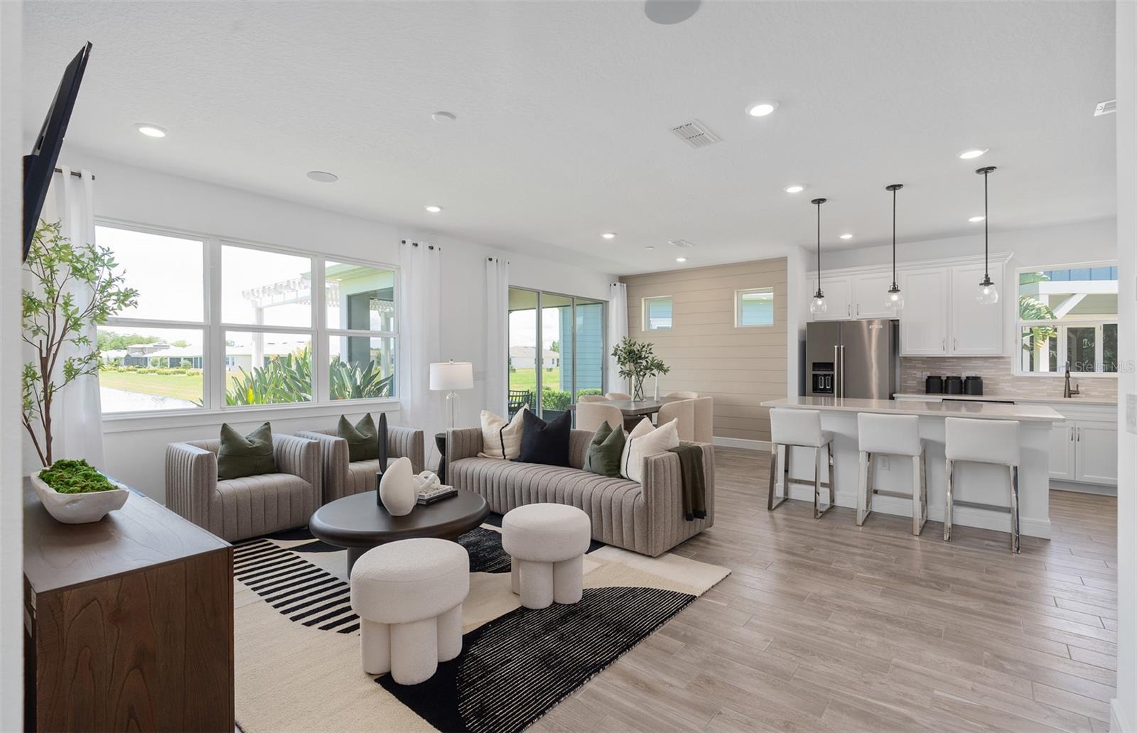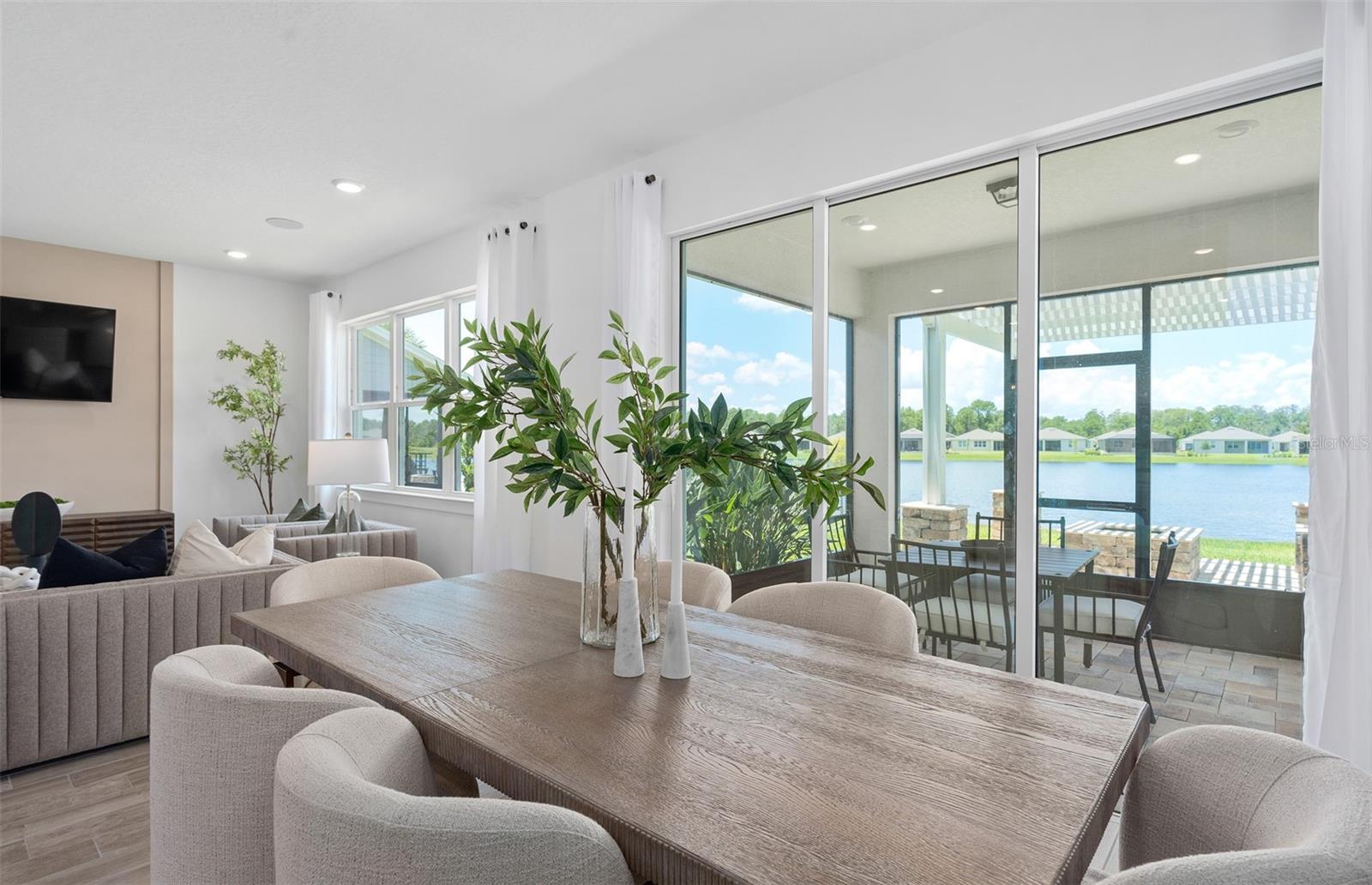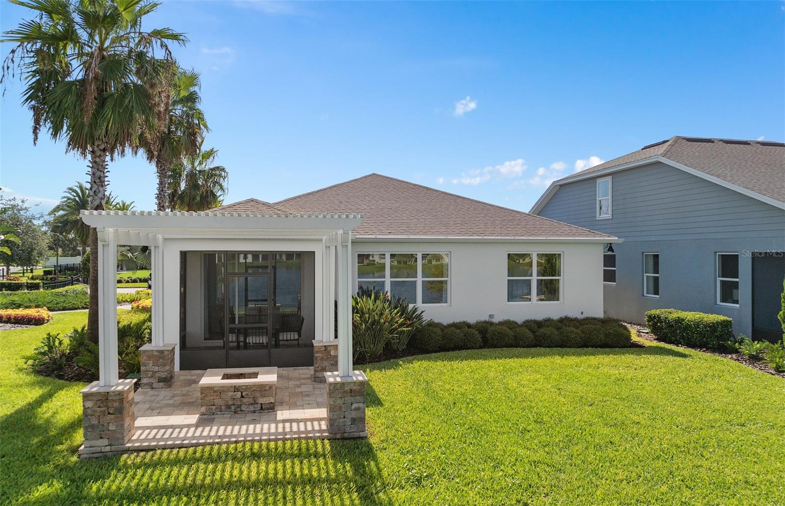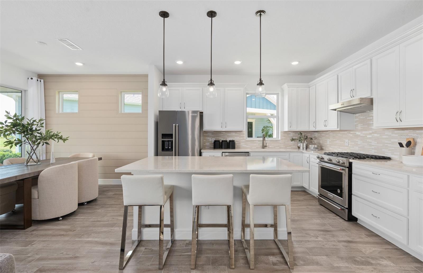 Welcome to the Prosperity Model Home by Del Webb, where convenience and luxury meet in perfect harmony. Originally a Model Home, this stunning one-story home offers 2 spacious bedrooms, an open flex room, and 2 beautifully appointed bathrooms situated on a homesite with a beautiful water view. The heart of the home is the brand-new kitchen, showcasing elegant 42” soft-close cabinetry paired with Quartz countertops. Enjoy the functionality and beauty of upgraded KitchenAid stainless steel appliances, including a refrigerator and a natural gas range, all highlighted by stylish tile backsplash, a single-bowl granite sink, upgraded faucet, and pendant lighting for that touch of sophistication. The open-concept design seamlessly flows into the gathering room, making this space perfect for both cooking and socializing. The spacious kitchen island offers the perfect setting for everything from everyday meal prep to casual dining with family and friends. Just beyond, the screened-in, covered lanai invites seamless indoor-outdoor living, ideal for enjoying Florida's beautiful weather year-round. The Prosperity Model Home truly shines when it comes to outdoor entertaining, featuring a pavered lanai complete with a charming gazebo and cozy fire pit, all overlooking a tranquil pond located just beyond the rear property line. As we travel back inside, the private owner's suite, located at the rear of the home for ultimate privacy, offers a serene escape with an en suite bathroom featuring quartz-topped dual vanity sinks, and a frameless glass-enclosed shower with a built-in bench. At the front of the home, the spare bedroom, bathroom, and versatile open flex room ensure that everyone has their own space. Wood-look tile flooring spans the home, except for in the bedrooms where you’ll find plush, stain-resistant Shaw Carpet. The laundry room itself offers both style and convenience with a brand-new Whirlpool washer and dryer adding a touch of elegance to everyday tasks. From the brushed nickel hardware finishes to the tall 8' interior doors, no detail of this former model home is overlooked. Comfort height toilets, epoxy finish on the garage floor, a custom built-in drop zone, and rain gutters add both style and ease to daily living. Don't miss out on your chance to own one of the best homes in the neighborhood! Schedule a tour today!