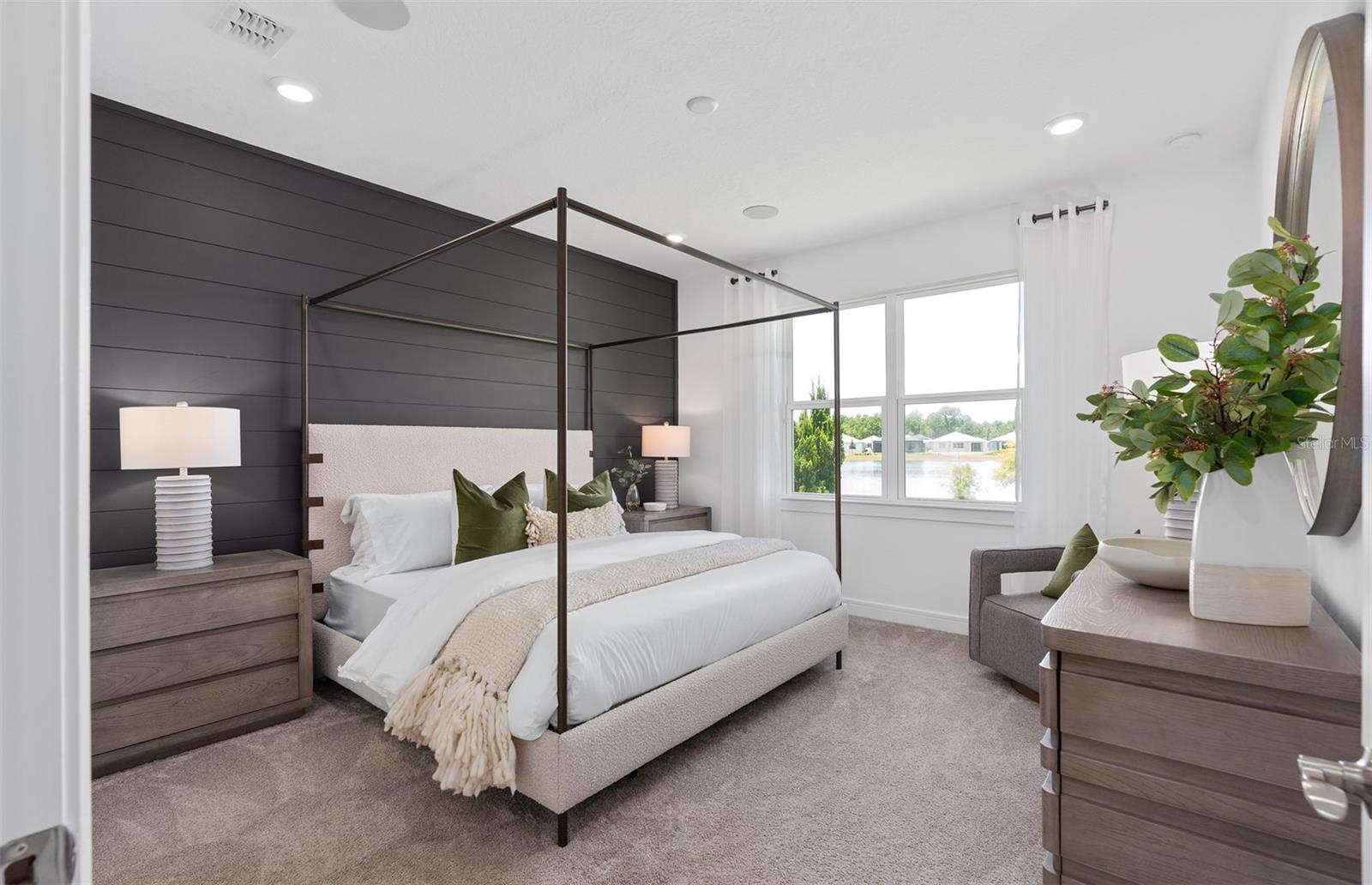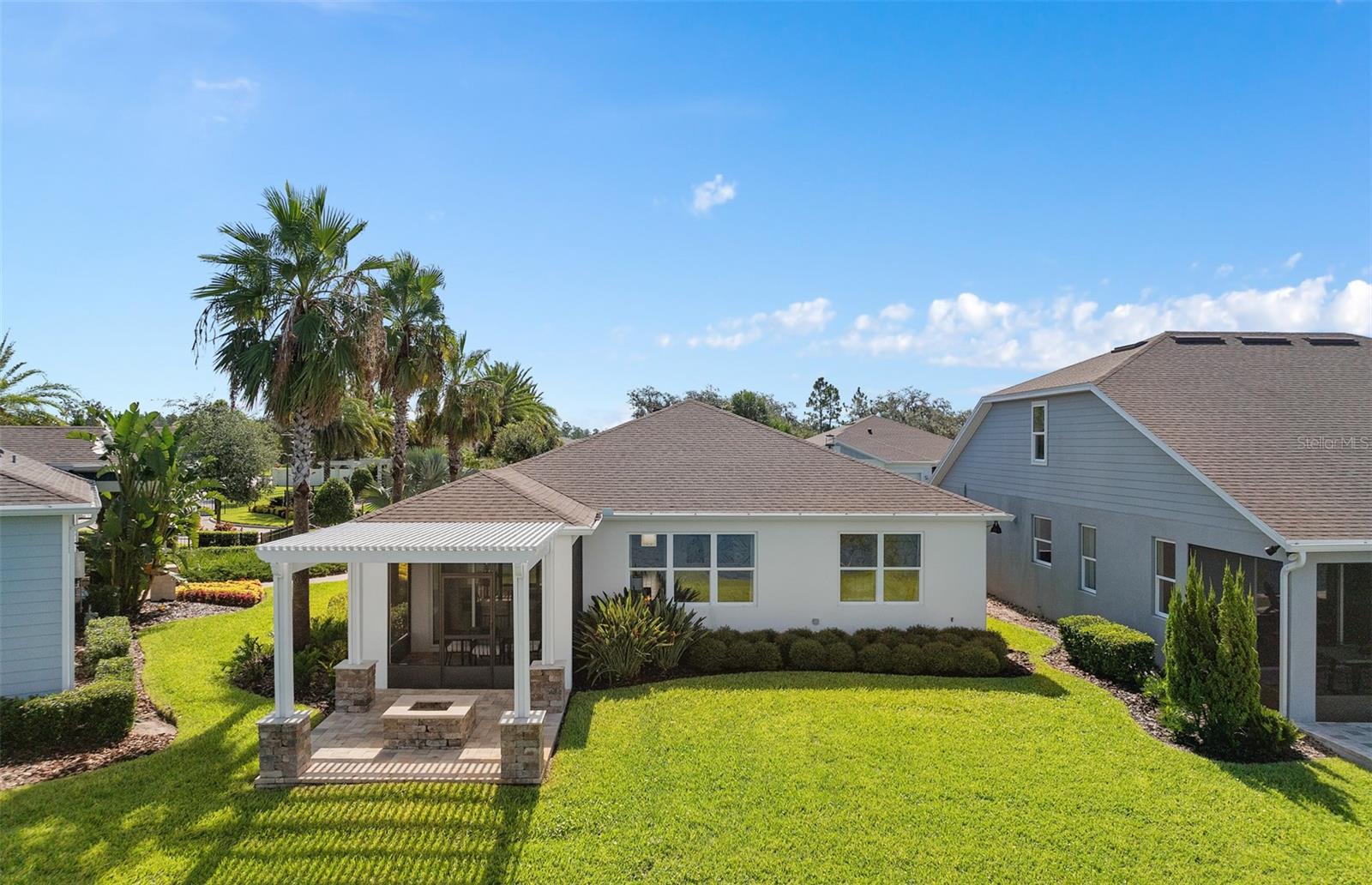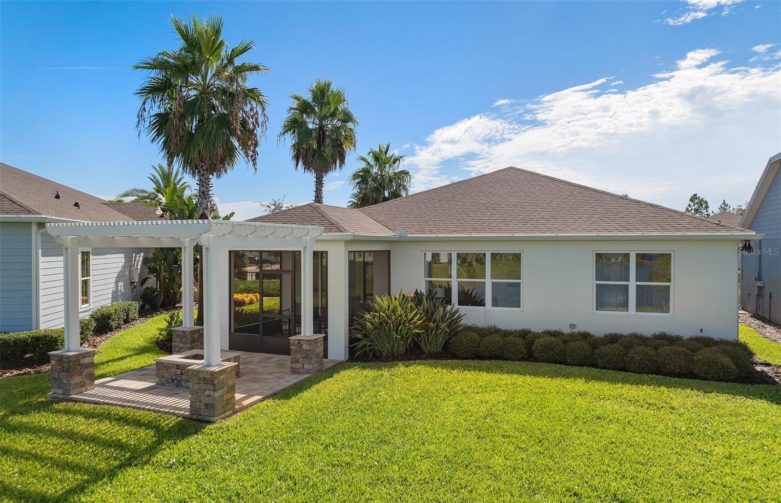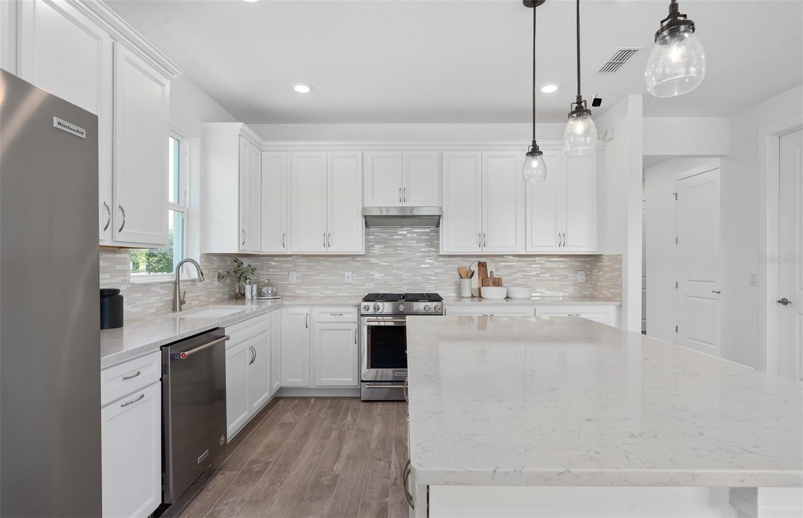 Welcome to the Prosperity Model Home by Del Webb, where convenience and luxury meet in perfect harmony. Originally a Model Home, this stunning one-story home offers 2 spacious bedrooms, an open flex room, and 2 beautifully appointed bathrooms situated on a homesite with a beautiful water view. The heart of the home is the brand-new kitchen, showcasing elegant 42” soft-close cabinetry paired with Quartz countertops. Enjoy the functionality and beauty of upgraded KitchenAid stainless steel appliances, including a refrigerator and a natural gas range, all highlighted by stylish tile backsplash, a single-bowl granite sink, upgraded faucet, and pendant lighting for that touch of sophistication. The open-concept design seamlessly flows into the gathering room, making this space perfect for both cooking and socializing. The spacious kitchen island offers the perfect setting for everything from everyday meal prep to casual dining with family and friends. Just beyond, the screened-in, covered lanai invites seamless indoor-outdoor living, ideal for enjoying Florida's beautiful weather year-round. The Prosperity Model Home truly shines when it comes to outdoor entertaining, featuring a pavered lanai complete with a charming gazebo and cozy fire pit, all overlooking a tranquil pond located just beyond the rear property line. As we travel back inside, the private owner's suite, located at the rear of the home for ultimate privacy, offers a serene escape with an en suite bathroom featuring quartz-topped dual vanity sinks, and a frameless glass-enclosed shower with a built-in bench. At the front of the home, the spare bedroom, bathroom, and versatile open flex room ensure that everyone has their own space. Wood-look tile flooring spans the home, except for in the bedrooms where you’ll find plush, stain-resistant Shaw Carpet. The laundry room itself offers both style and convenience with a brand-new Whirlpool washer and dryer adding a touch of elegance to everyday tasks. From the brushed nickel hardware finishes to the tall 8' interior doors, no detail of this former model home is overlooked. Comfort height toilets, epoxy finish on the garage floor, a custom built-in drop zone, and rain gutters add both style and ease to daily living. Don't miss out on your chance to own one of the best homes in the neighborhood! Schedule a tour today!