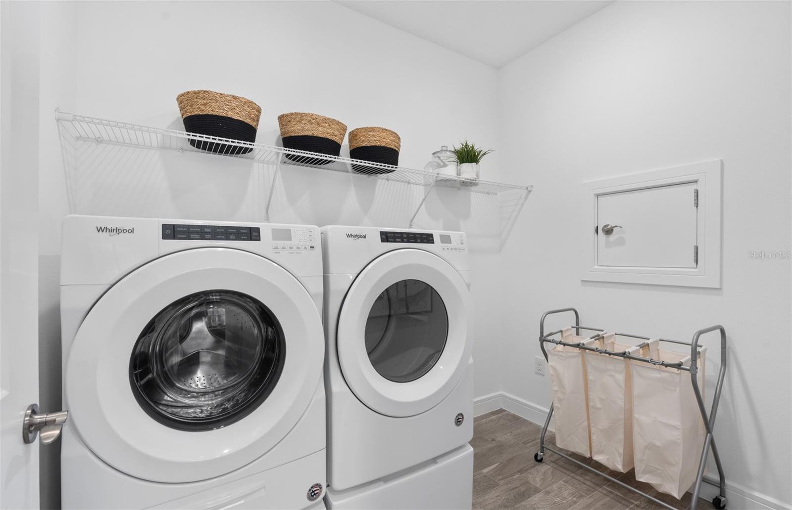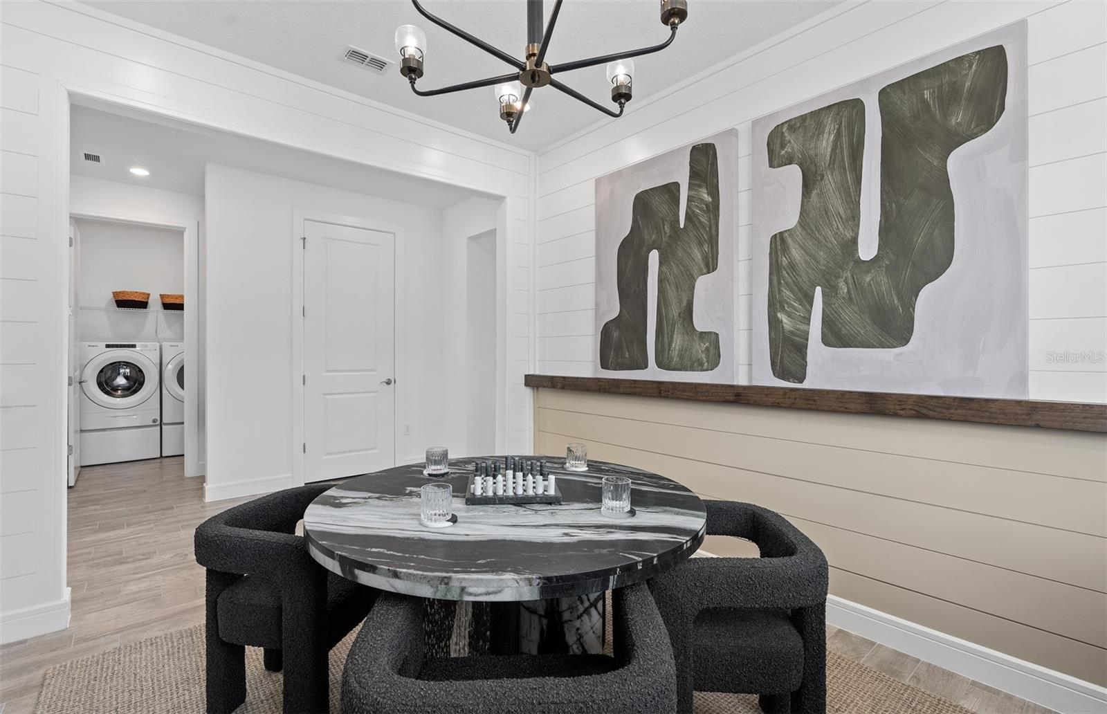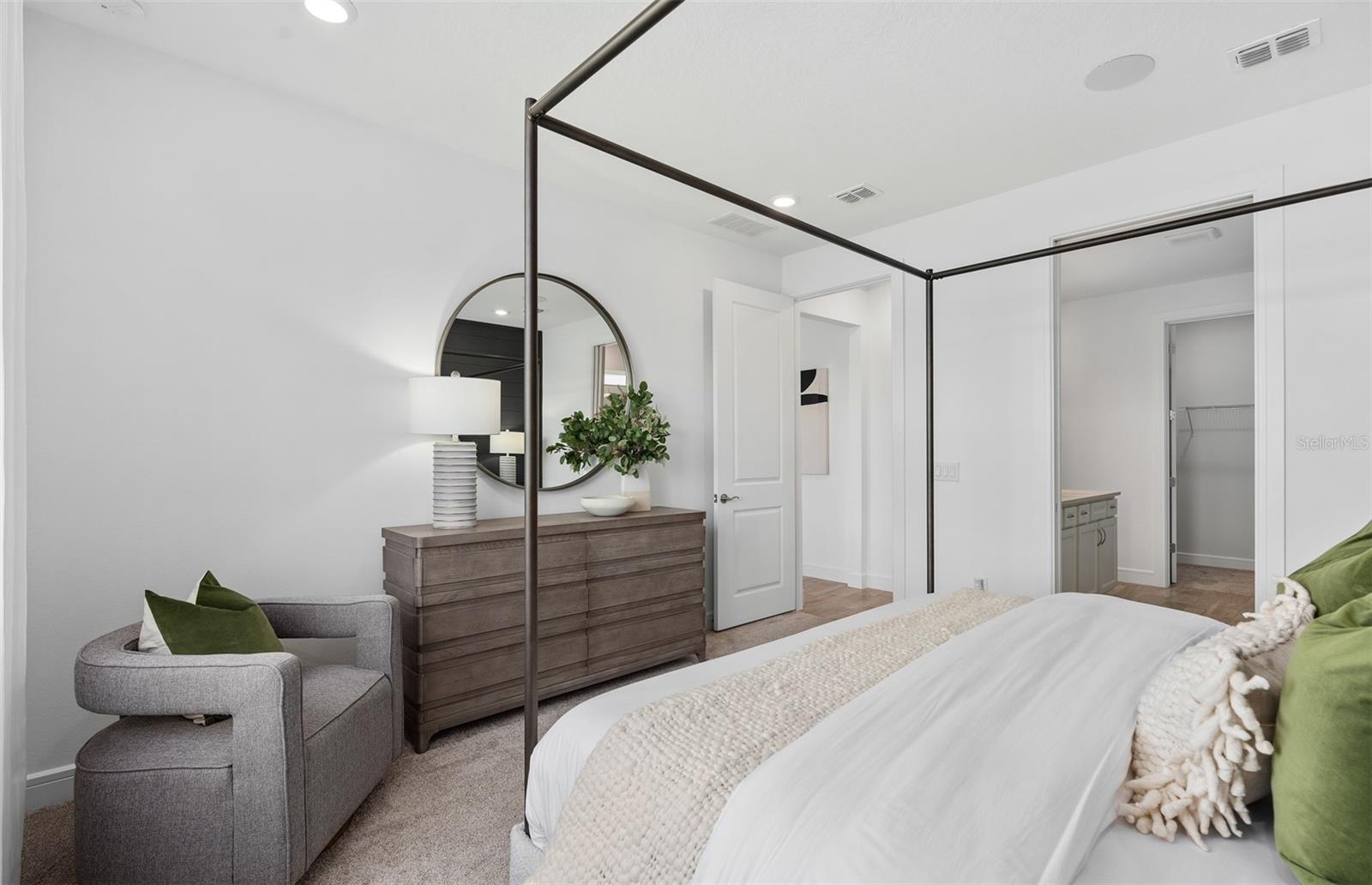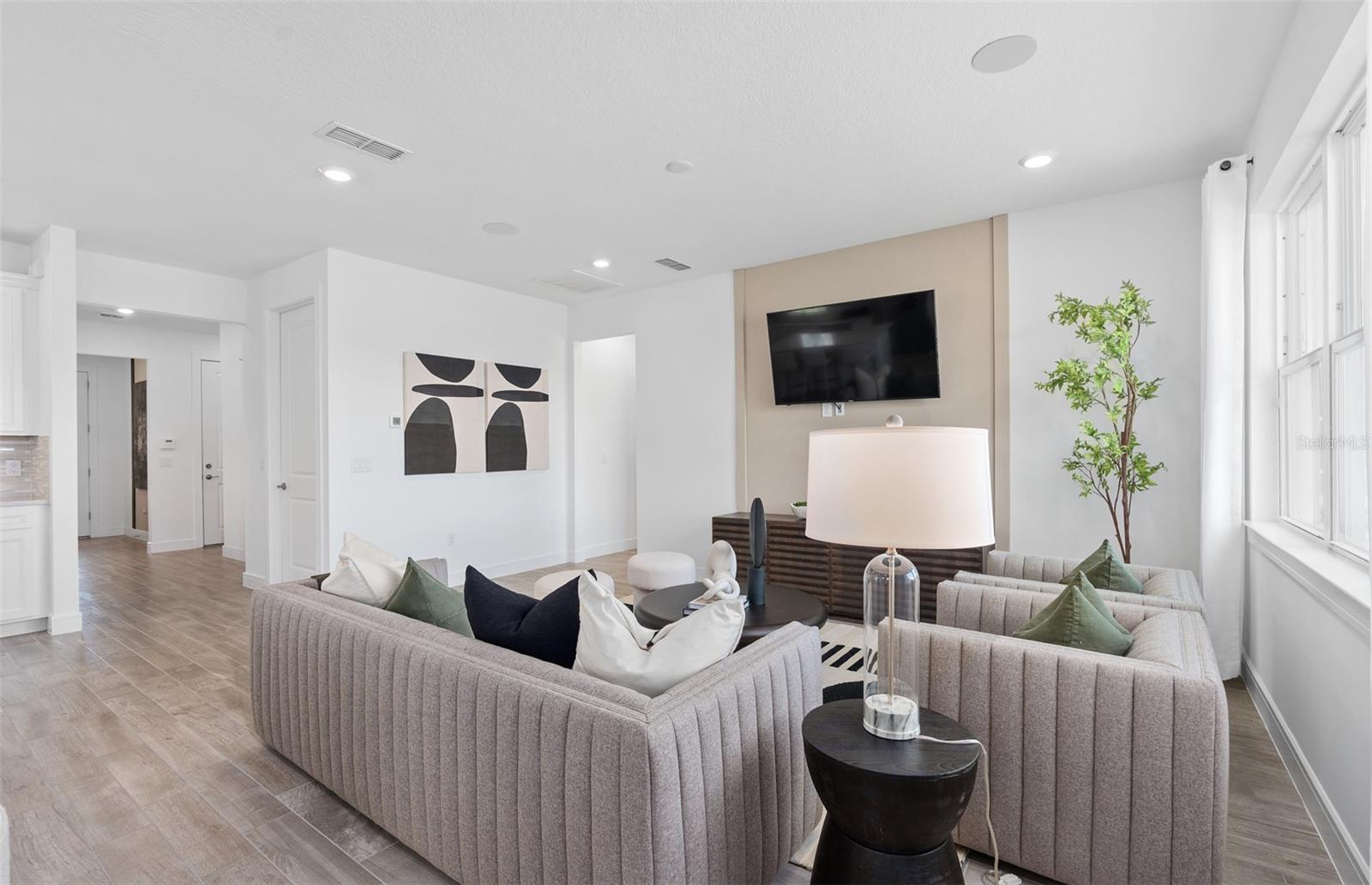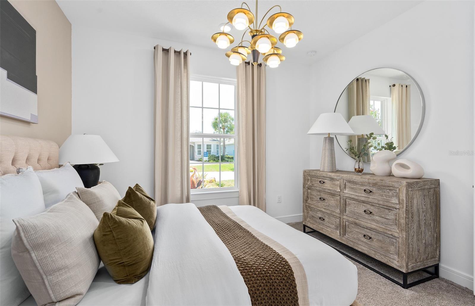 Welcome to the Prosperity Model Home by Del Webb, where convenience and luxury meet in perfect harmony. Originally a Model Home, this stunning one-story home offers 2 spacious bedrooms, an open flex room, and 2 beautifully appointed bathrooms situated on a homesite with a beautiful water view. The heart of the home is the brand-new kitchen, showcasing elegant 42” soft-close cabinetry paired with Quartz countertops. Enjoy the functionality and beauty of upgraded KitchenAid stainless steel appliances, including a refrigerator and a natural gas range, all highlighted by stylish tile backsplash, a single-bowl granite sink, upgraded faucet, and pendant lighting for that touch of sophistication. The open-concept design seamlessly flows into the gathering room, making this space perfect for both cooking and socializing. The spacious kitchen island offers the perfect setting for everything from everyday meal prep to casual dining with family and friends. Just beyond, the screened-in, covered lanai invites seamless indoor-outdoor living, ideal for enjoying Florida's beautiful weather year-round. The Prosperity Model Home truly shines when it comes to outdoor entertaining, featuring a pavered lanai complete with a charming gazebo and cozy fire pit, all overlooking a tranquil pond located just beyond the rear property line. As we travel back inside, the private owner's suite, located at the rear of the home for ultimate privacy, offers a serene escape with an en suite bathroom featuring quartz-topped dual vanity sinks, and a frameless glass-enclosed shower with a built-in bench. At the front of the home, the spare bedroom, bathroom, and versatile open flex room ensure that everyone has their own space. Wood-look tile flooring spans the home, except for in the bedrooms where you’ll find plush, stain-resistant Shaw Carpet. The laundry room itself offers both style and convenience with a brand-new Whirlpool washer and dryer adding a touch of elegance to everyday tasks. From the brushed nickel hardware finishes to the tall 8' interior doors, no detail of this former model home is overlooked. Comfort height toilets, epoxy finish on the garage floor, a custom built-in drop zone, and rain gutters add both style and ease to daily living. Don't miss out on your chance to own one of the best homes in the neighborhood! Schedule a tour today!