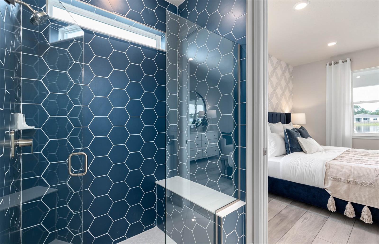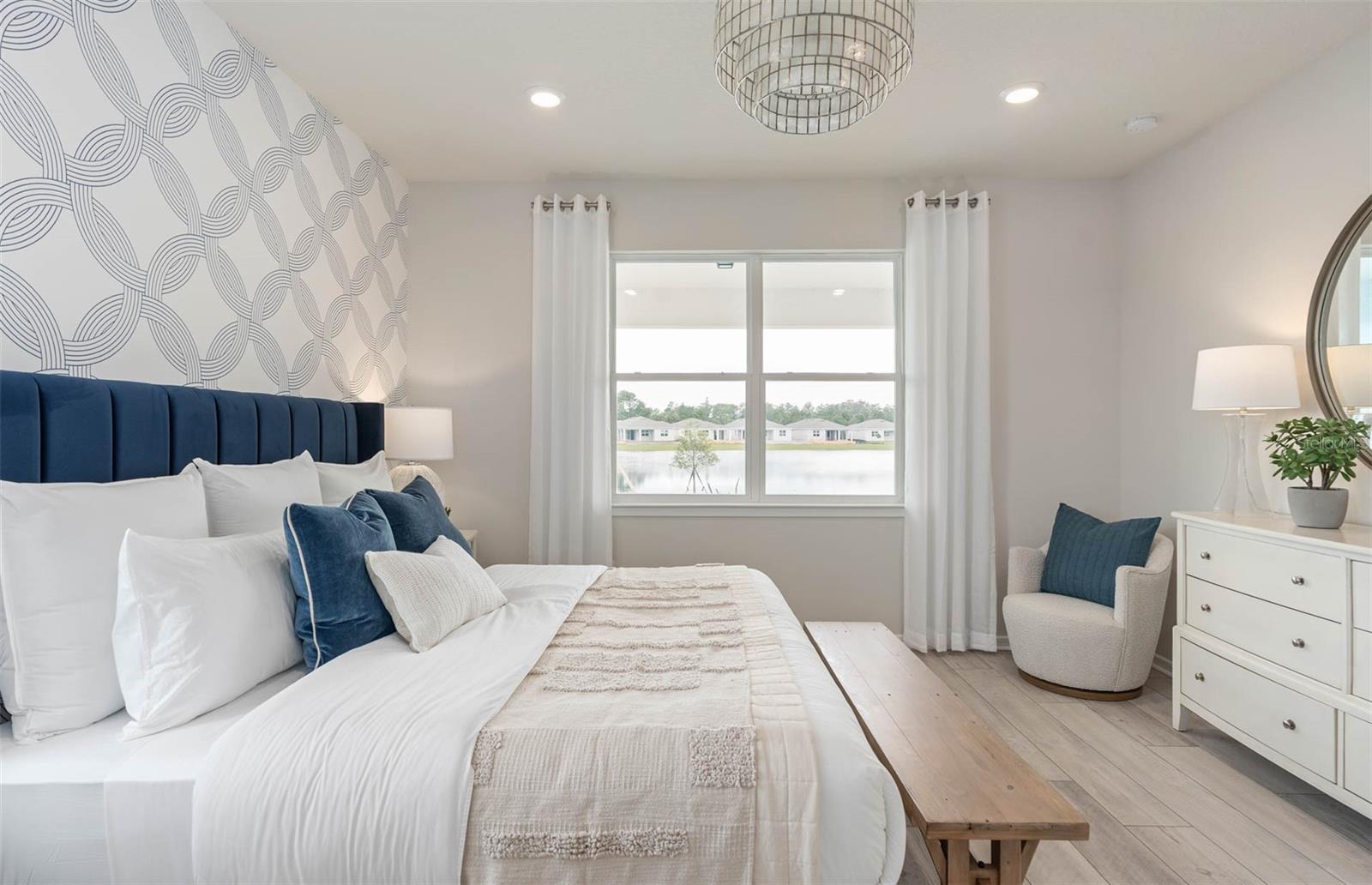 Originally a Model Home, the one-story Contour home by Del Webb features 2 bedrooms, an open flex room, 2 bathrooms, a 2-car garage, and an extended covered lanai—ideal for both comfortable living and easy entertaining. The heart of this home is the stunning kitchen, designed for both beauty and function. It’s appointed with 42” soft-close cabinetry, elegant quartz countertops, and a striking decorative tile backsplash. The upgraded Whirlpool appliances—including a natural gas range and a refrigerator—along with a stainless-steel single-bowl sink and upgraded faucet, make this space a chef's dream. Whether preparing meals or hosting guests, this kitchen inspires. The open-concept design flows seamlessly into the café and gathering room, both flooded with natural light from ample windows. A sliding glass door opens to the extended covered lanai which features a beautiful water view, merging indoor and outdoor living for an inviting and relaxing experience. The owner's suite, located at the back of the home for maximum privacy, offers a true retreat. The spa-inspired en suite bath features a dual vanity with quartz countertops, an enclosed toilet, a frameless glass-enclosed shower with a built-in bench and tile extending to the ceiling, a linen closet, and a spacious walk-in closet. At the front of the home, the secondary bedroom and bathroom are paired with the versatile flex room, providing privacy and space for guests or loved ones. The flex room can serve as a home office, hobby space, or anything that fits your lifestyle. Designer touches inspired by this former model home are evident throughout, with brushed nickel plumbing fixtures and hardware, a Whirlpool washer and dryer. Every detail of this home has been thoughtfully curated, from comfort-height toilets to the Sherwin Williams Agreeable Gray interior paint and 8’ interior doors. The exterior includes thoughtfully placed gutters. Inside, wood-look luxury vinyl plank flooring adds warmth and style to the bedrooms, while durable tile flooring enhances the main living areas, bathrooms, and laundry room for easy maintenance and everyday practicality. Don’t miss the chance to make this exceptional home yours. Schedule a tour today!