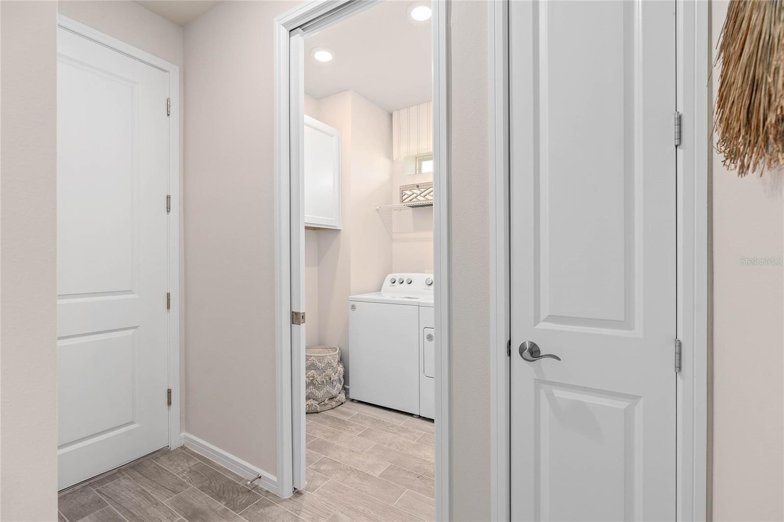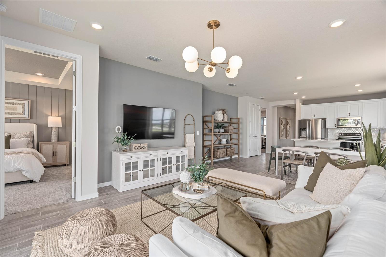 The stunning Ellenwood Villa by Del Webb blends luxury and convenience, featuring 3 bedrooms, and 2 bathrooms in a thoughtfully designed layout that maximizes both comfort and style. The open-concept kitchen, café, and gathering room are filled with natural light, creating an inviting and spacious atmosphere. Tall ceilings, a glass insert at the front door, abundant windows, and a sliding glass door that opens to the covered lanai seamlessly extend the living space, making it perfect for effortless indoor-outdoor living. The kitchen features stainless steel Whirlpool appliances (including the refrigerator), 42” soft-close cabinetry, Quartz countertops, a decorative tile backsplash, an upgraded faucet, and a stainless-steel single-bowl sink. Whether you're preparing a gourmet meal or entertaining guests, this kitchen has everything you need. Tucked at the rear of the home for maximum privacy, the owner’s suite offers a luxurious retreat. The spa-like en suite bathroom features a frameless glass-enclosed shower with built-in bench, an enclosed toilet, a quartz-topped dual vanity, and a linen closet—creating the perfect environment for relaxation. The secondary bedrooms and bathroom located at the front of the home provide an additional layer of privacy, offering a tranquil space when you need it most. Designer-curated finishes elevate every corner of this home, including pendant pre-wire, brushed nickel hardware and plumbing fixtures, Whirlpool washer and dryer, and 2” faux wood blinds. Luxury touches like 8’ interior doors, comfort-height toilets, Sherwin Williams Drift of Mist Interior Wall Paint, wood-look luxury vinyl plank flooring throughout the bedrooms and living spaces, and beautiful tile in the bathrooms and laundry room enhance the home's style and comfort. For those who appreciate modern technology, this home comes equipped with a smart thermostat, smart doorbell, and LED downlights, ensuring your home is as connected as it is beautiful. Schedule a tour today!