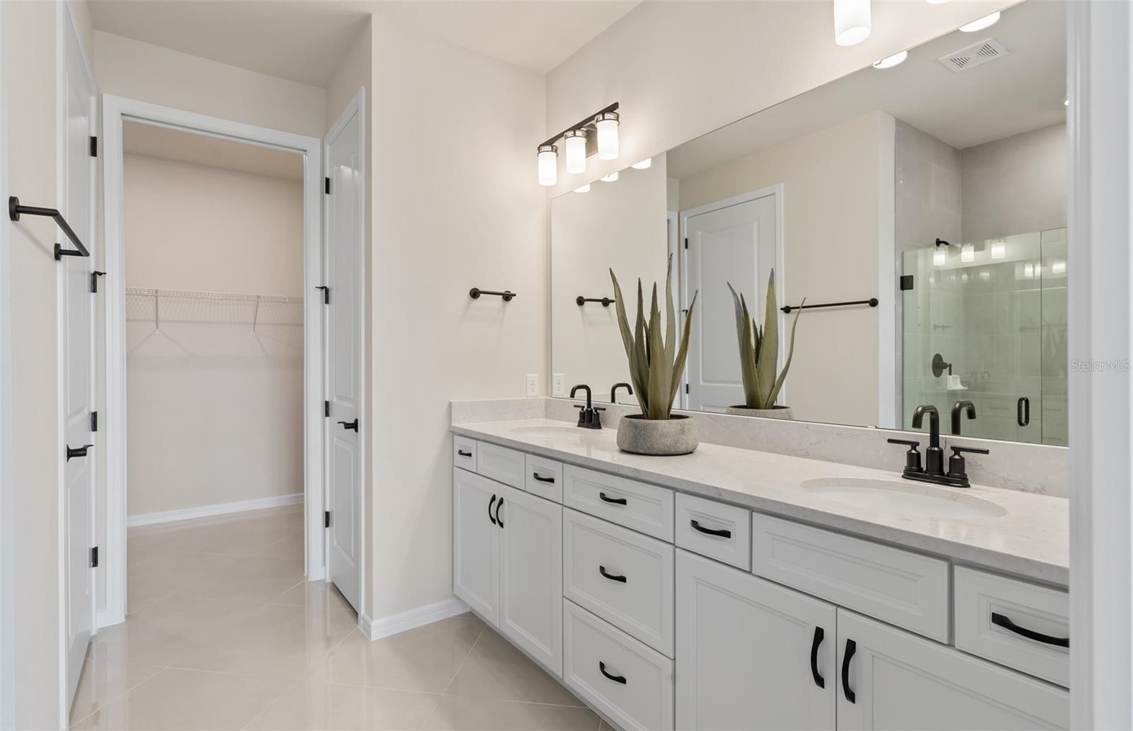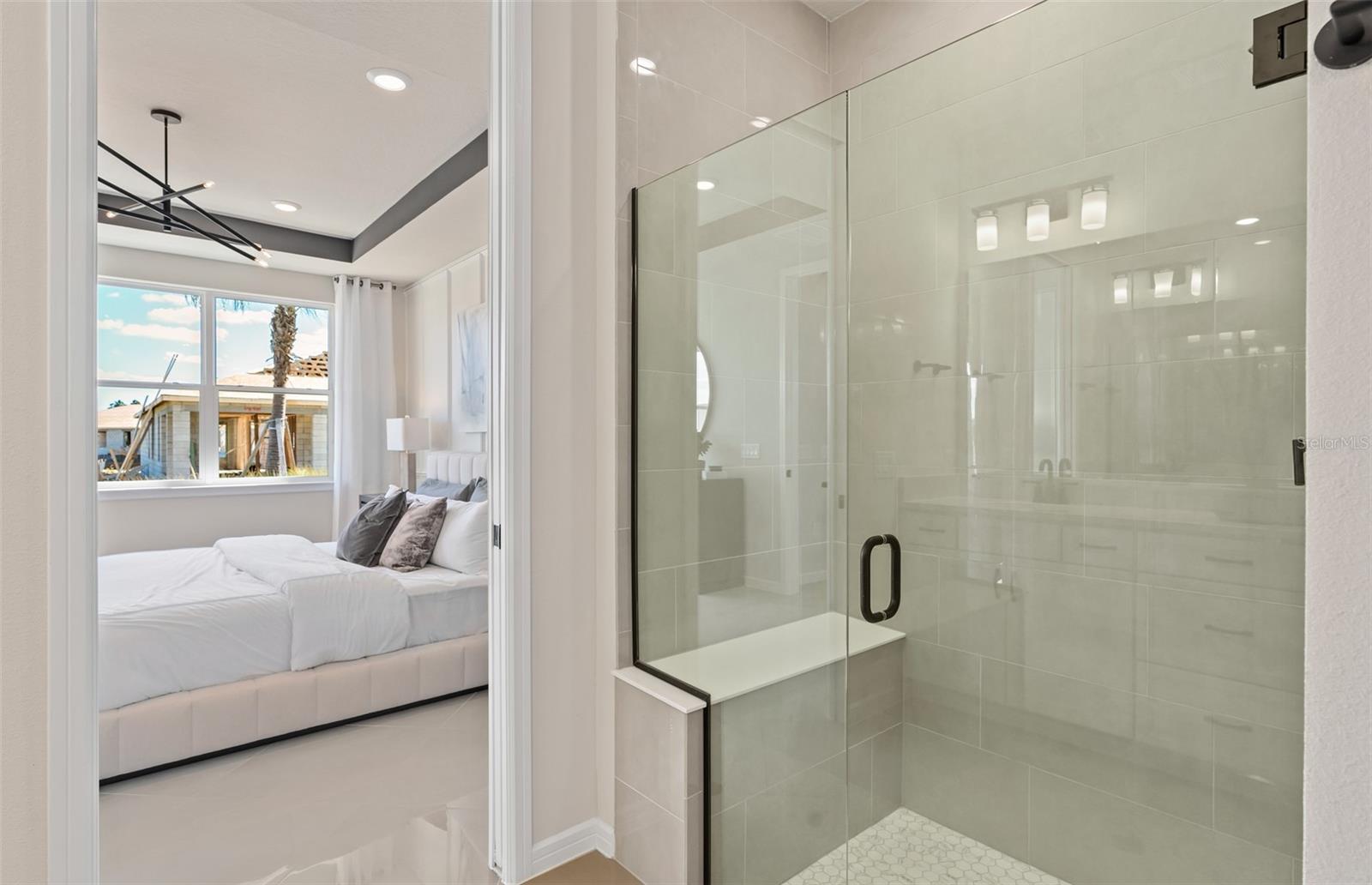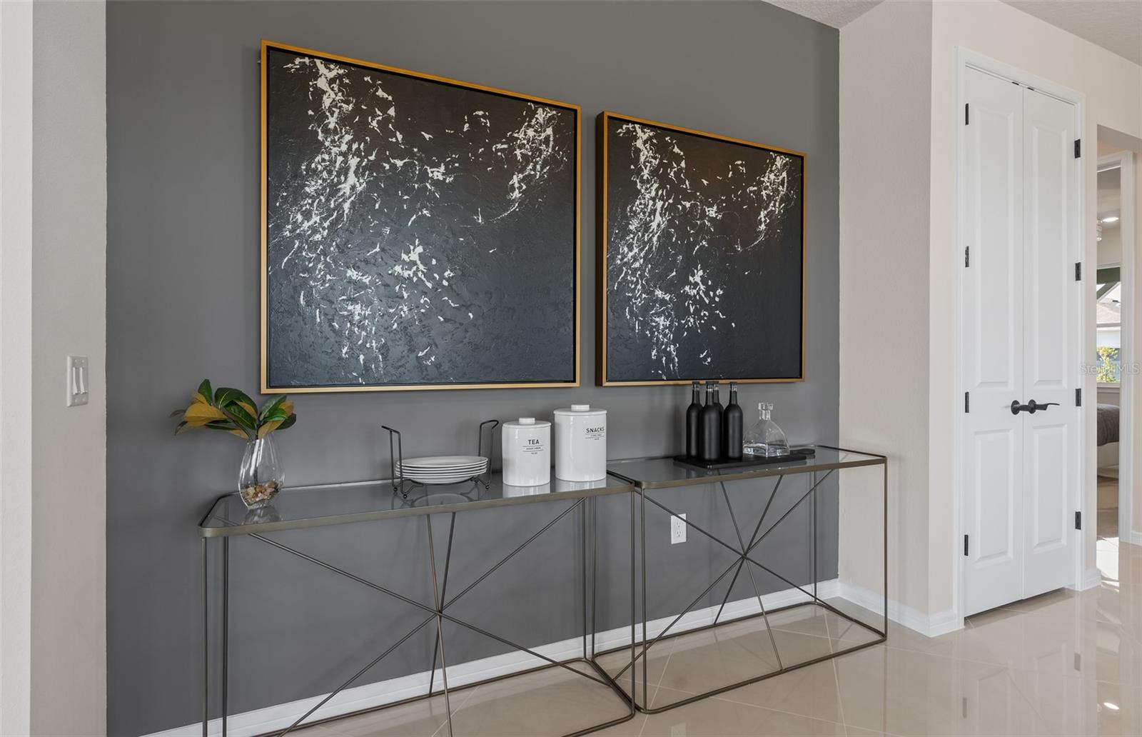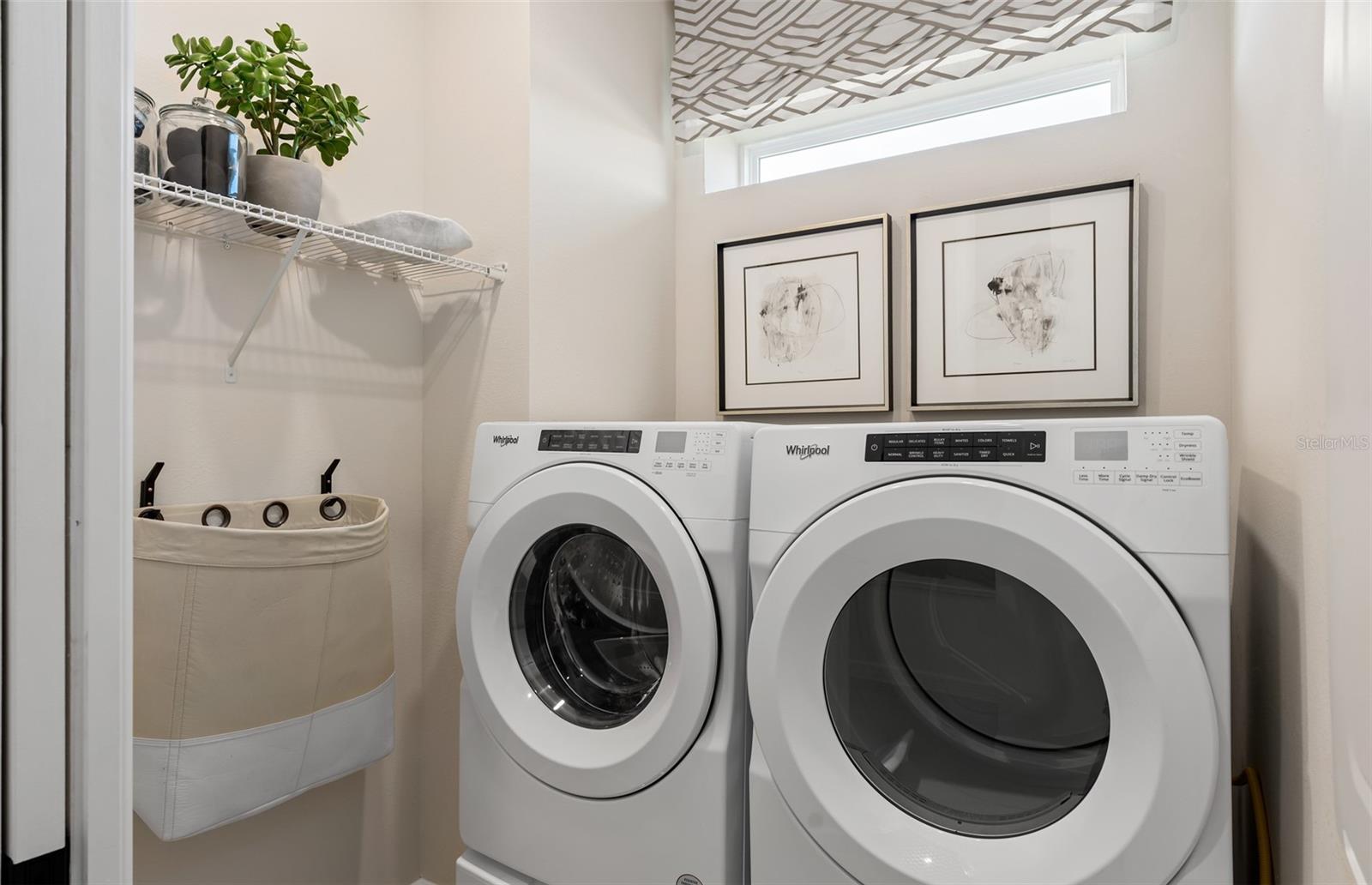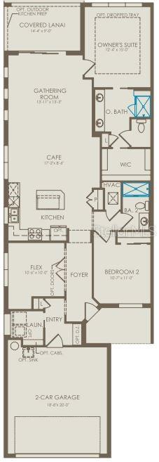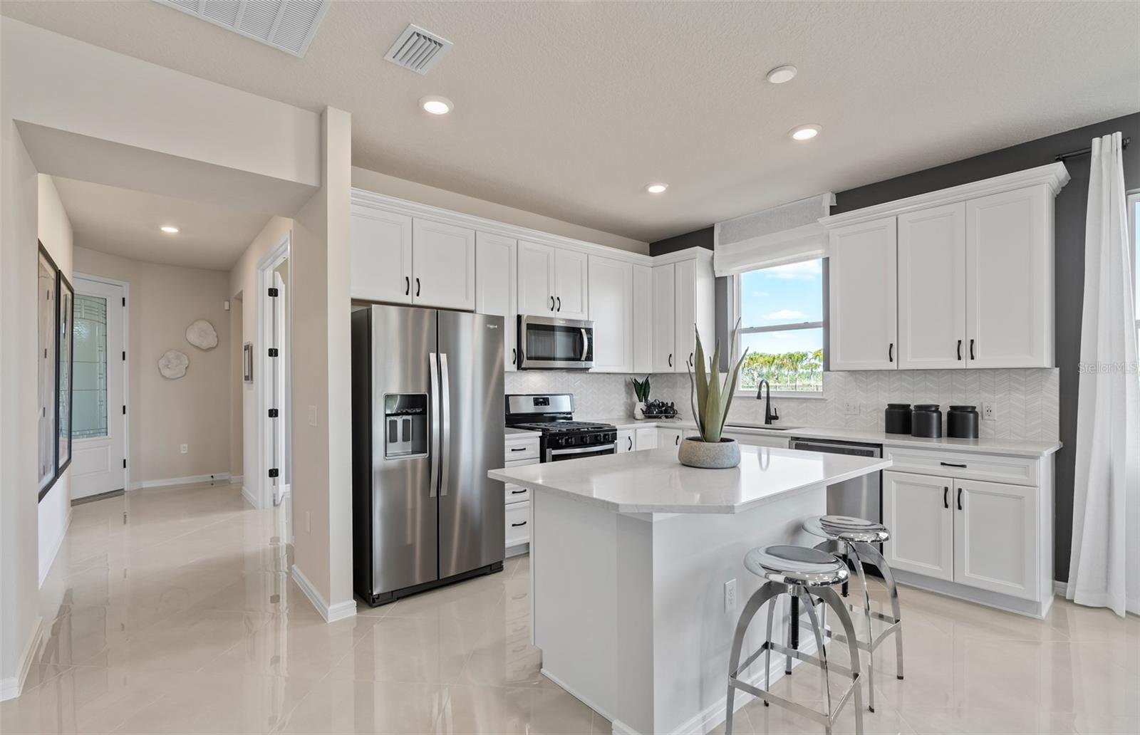The stunning Ellenwood Villa by Del Webb blends luxury and convenience, featuring 2 bedrooms, an enclosed flex room, and 2 bathrooms in a thoughtfully designed layout that maximizes both comfort and style. The open-concept kitchen, café, and gathering room are filled with natural light, creating an inviting and spacious atmosphere. Tall ceilings, a glass insert at the front door, abundant windows, and a sliding glass door that opens to the covered lanai seamlessly extend the living space, making it perfect for effortless indoor-outdoor living. The kitchen features stainless steel Whirlpool appliances (including a refrigerator and natural gas range), Lillian White soft-close cabinetry, Lyra Quartz countertops, a decorative tile backsplash, an upgraded faucet, and a stainless-steel single-bowl sink. Whether you're preparing a gourmet meal or entertaining guests, this kitchen has everything you need. Tucked at the rear of the home for maximum privacy, the owner’s suite offers a luxurious retreat. The spa-like en suite bathroom features a frameless glass-enclosed shower with built-in bench, an enclosed toilet, a quartz-topped dual vanity, and a linen closet—creating the perfect environment for relaxation. The secluded secondary bedroom and bathroom provide an additional layer of privacy, offering a tranquil space when you need it most. The front of the home features an enclosed flex room, offering endless possibilities as a home office, hobby room, or any other space that suits your needs. Designer-curated finishes elevate every corner of this home, including pendant pre-wire, brushed nickel hardware and plumbing fixtures, whirlpool washer/dryer, and 2” faux wood blinds. Luxury touches like 8’ interior doors, comfort-height toilets, Sherwin Williams Drift of Mist interior Wall Paint, and wood-look tile throughout enhance the home's style and comfort. For those who appreciate modern technology, this home comes equipped with a smart thermostat, smart doorbell, and LED downlights, ensuring your home is as connected as it is beautiful. This home offers the perfect combination of luxury, convenience, and modern design—an ideal place to live and relax. Schedule a tour today!