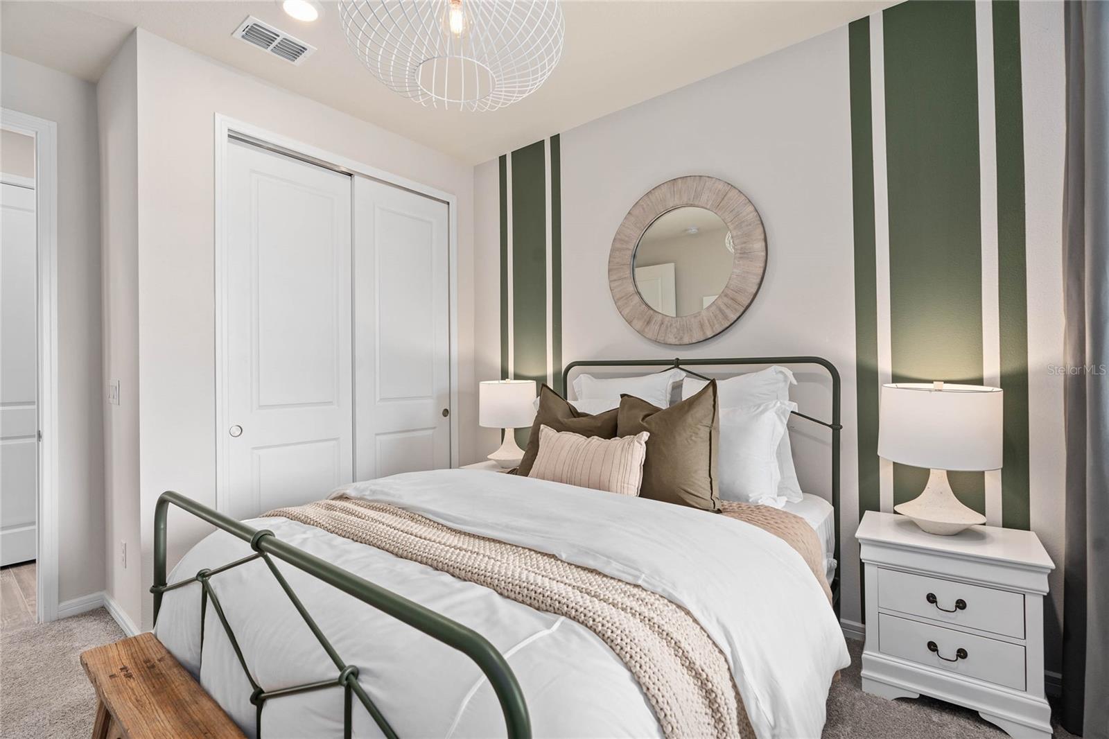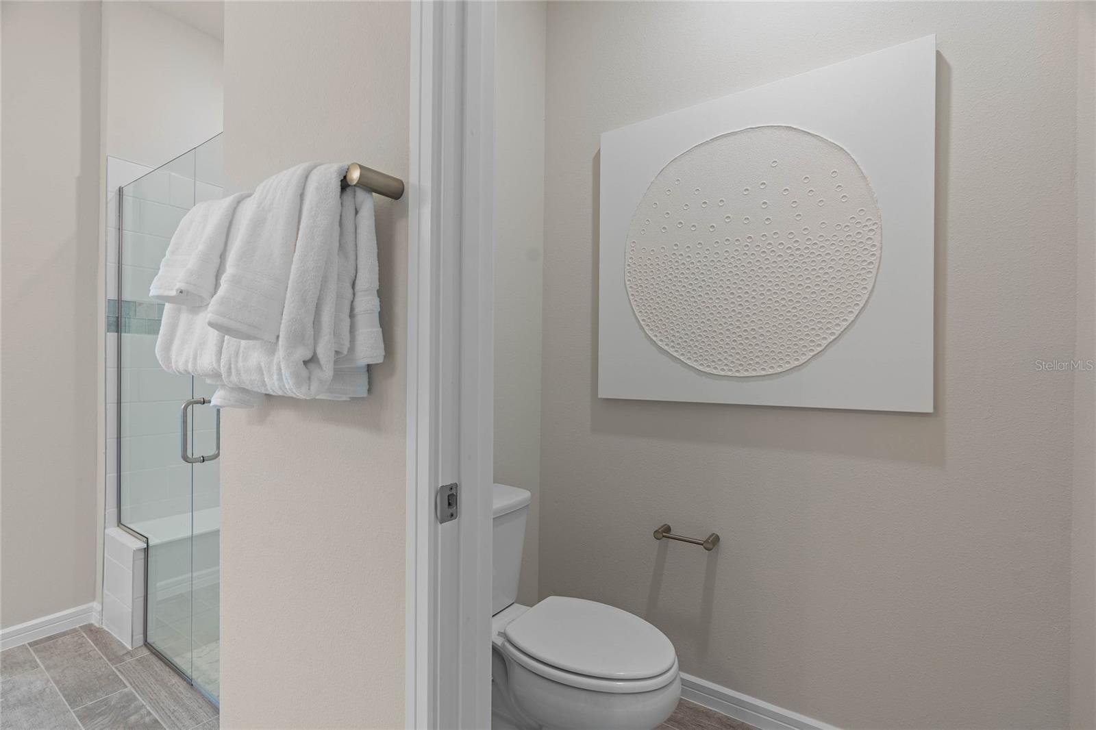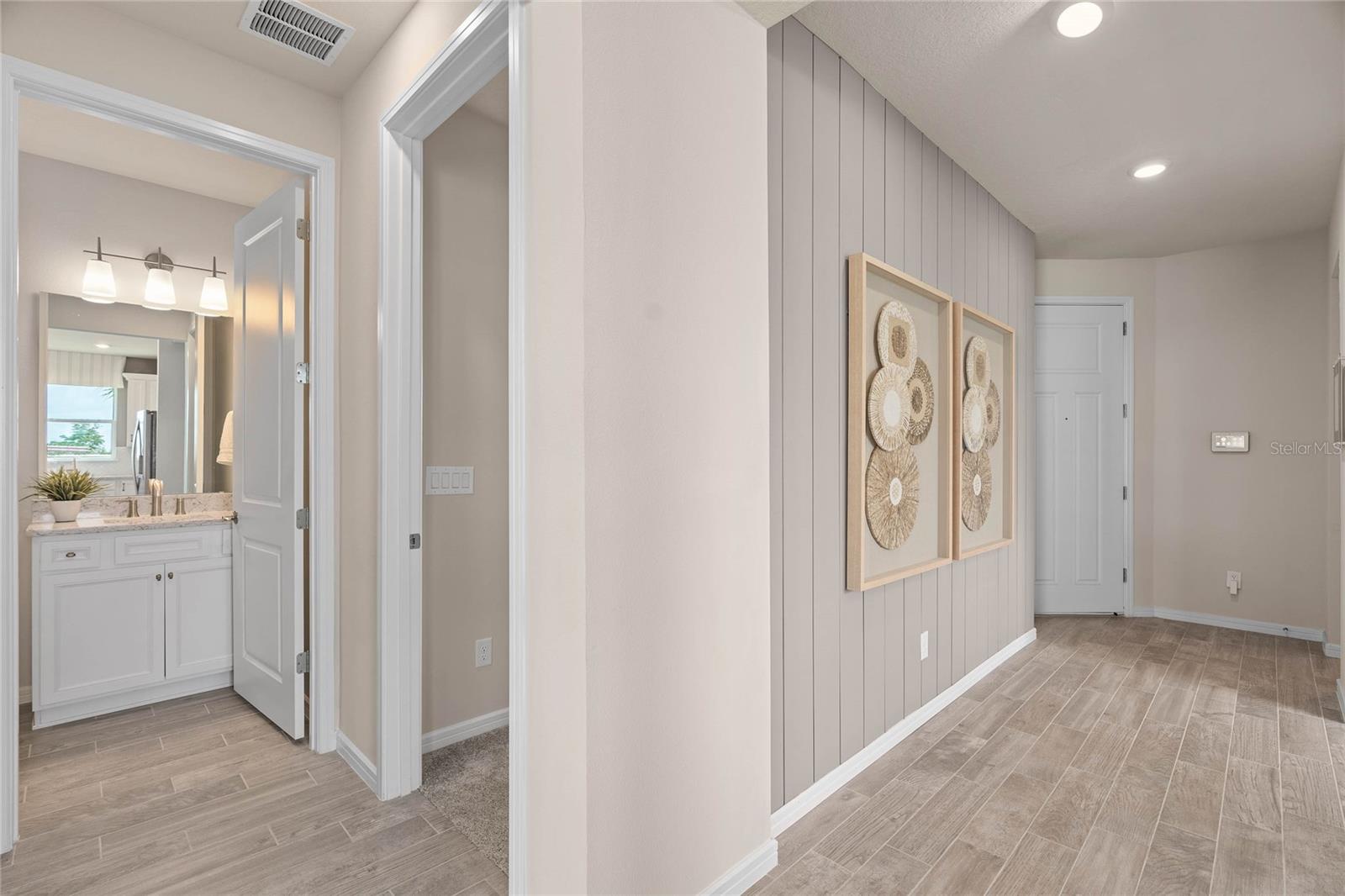 The stunning Ellenwood Villa by Del Webb blends luxury and convenience, featuring 3 bedrooms, and 2 bathrooms in a thoughtfully designed layout that maximizes both comfort and style. The open-concept kitchen, café, and gathering room are filled with natural light, creating an inviting and spacious atmosphere. Tall ceilings, a glass insert at the front door, abundant windows, and a sliding glass door that opens to the covered lanai seamlessly extend the living space, making it perfect for effortless indoor-outdoor living. The kitchen features stainless steel Whirlpool appliances (including the refrigerator), 42” soft-close cabinetry, Quartz countertops, a decorative tile backsplash, an upgraded faucet, and a stainless-steel single-bowl sink. Whether you're preparing a gourmet meal or entertaining guests, this kitchen has everything you need. Tucked at the rear of the home for maximum privacy, the owner’s suite offers a luxurious retreat. The spa-like en suite bathroom features a frameless glass-enclosed shower with built-in bench, an enclosed toilet, a quartz-topped dual vanity, and a linen closet—creating the perfect environment for relaxation. The secondary bedrooms and bathroom located at the front of the home provide an additional layer of privacy, offering a tranquil space when you need it most. Designer-curated finishes elevate every corner of this home, including pendant pre-wire, chrome hardware and plumbing fixtures, Whirlpool washer and dryer, and 2” faux wood blinds. Luxury touches like 8’ interior doors, comfort-height toilets, Sherwin Williams Drift of Mist Interior Wall Paint, Epoxy finish on the garage floor, and wood-look tile flooring throughout enhance the home's style and comfort. For those who appreciate modern technology, this home comes equipped with a smart thermostat, smart doorbell, and LED downlights, ensuring your home is as connected as it is beautiful. Schedule a tour today!