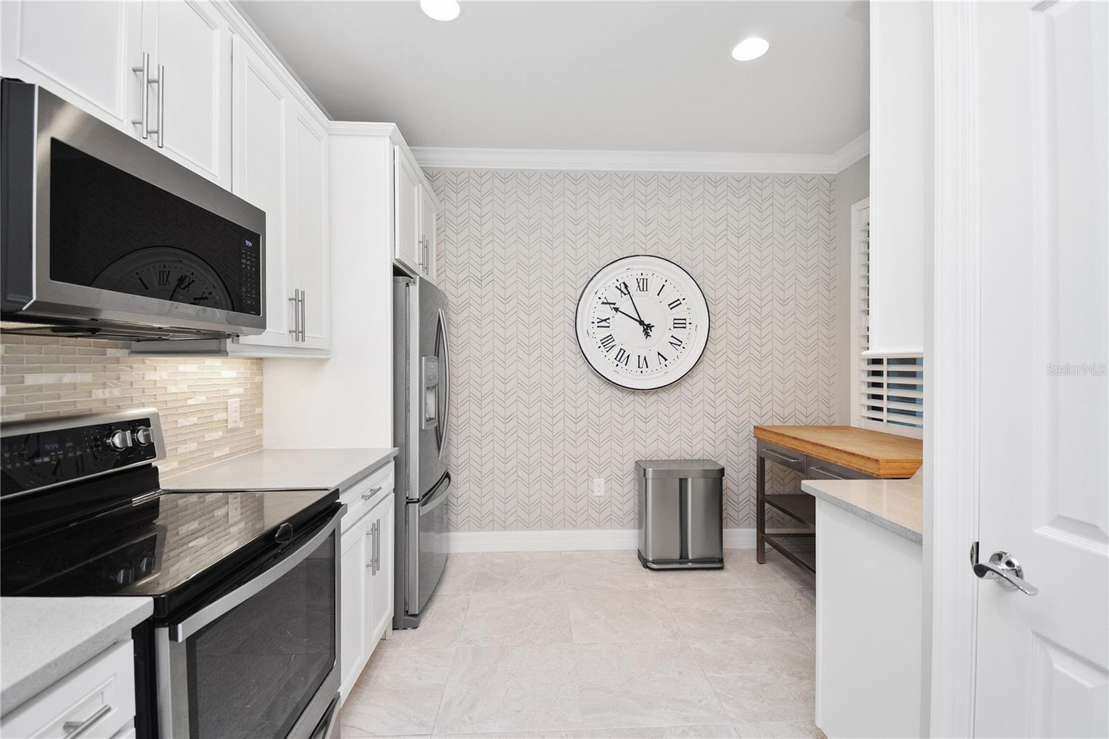 Step inside to 9' CEILINGS, 8' DOORWAYS, 5" baseboards and elegant CROWN MOLDING, creating a BRIGHT, upscale atmosphere throughout. Newly installed LUXURY VINYL PLANK FLOOR enhances both bedrooms, while the main living areas feature attractive 21" x 21" tile floors. The flexible den is ideal for a home office, hobby room, or extra guest space. The stylish kitchen showcases 42" solid MAPLE CABINETS with crown molding, under-cabinet lighting, STONE COUNTERS, STAINLESS STEEL Whirlpool appliances, added cabinetry for extra storage. Upgraded lighting also throughout the home for enhanced ambiance and functionality. The primary suite provides a peaceful retreat with a generous walk-in closet and a well-appointed bath featuring stone counters, comfort-height vanities, and a walk-in shower. PLANTATION SHUTTERS, TV supports with concealed wiring, and integrated network wiring bring modern convenience to every room.