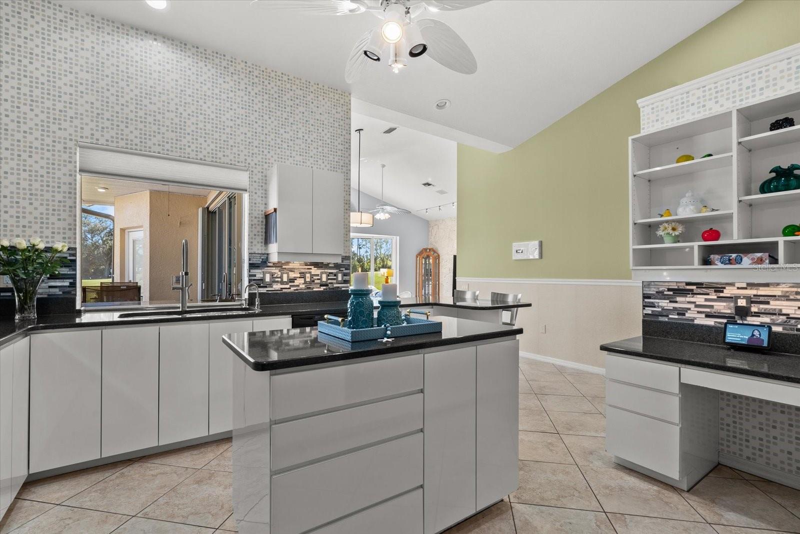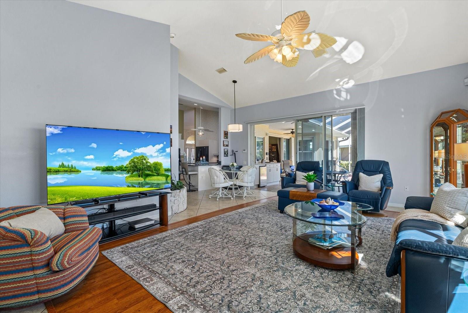 Step inside to discover vaulted ceilings, custom window treatments, and 18” ceramic tile flooring throughout the main living areas. The gourmet kitchen is a chef’s delight, featuring Cambria countertops, a 36" induction cooktop, double self-cleaning ovens, and a center island with storage and power. The family room exudes warmth with a natural coral accent wall, built-in planter, and wood-burning fireplace with an electric flame insert, while sliding doors open seamlessly to the lanai.
