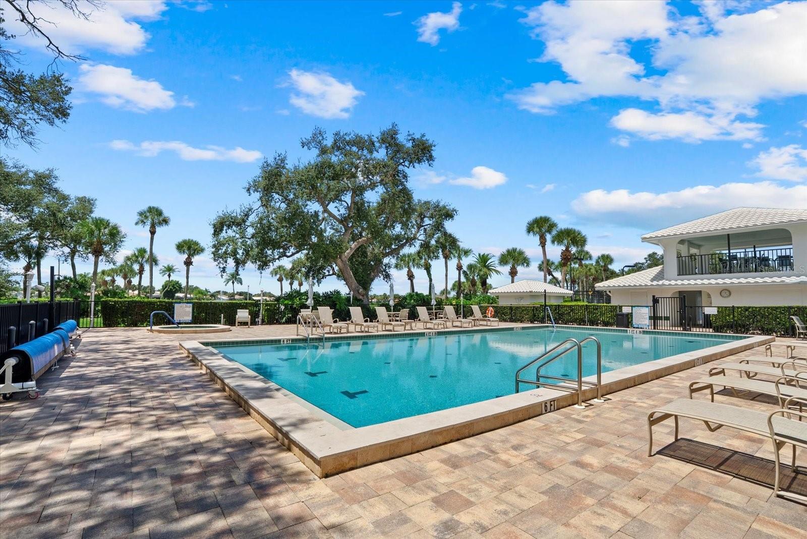 Outdoor living is exceptional with gorgeous sunset views, a screened travertine lanai, spa pool with hydro massage and waterfall feature , outdoor marine grade cabinetry with granite countertops, a half bath, and lush, mature landscaping. Recent updates include a new A/C (2024), variable-speed pool pump (2024), and a solar hot water system (2024).