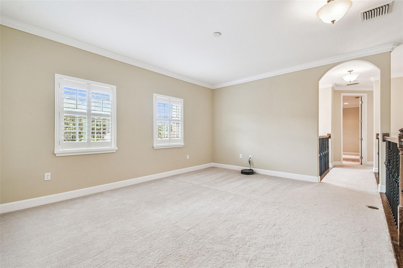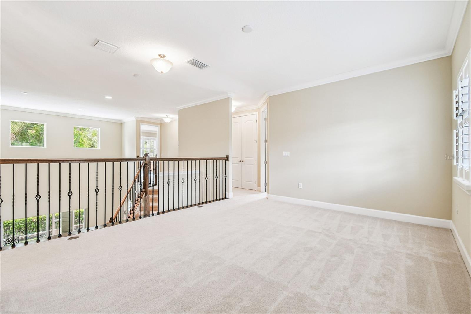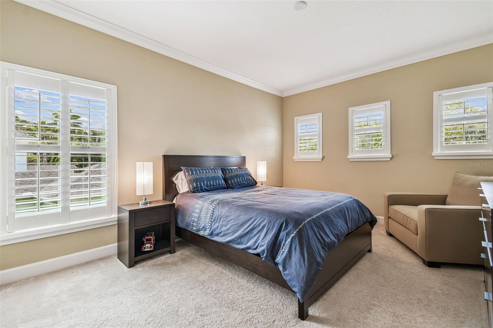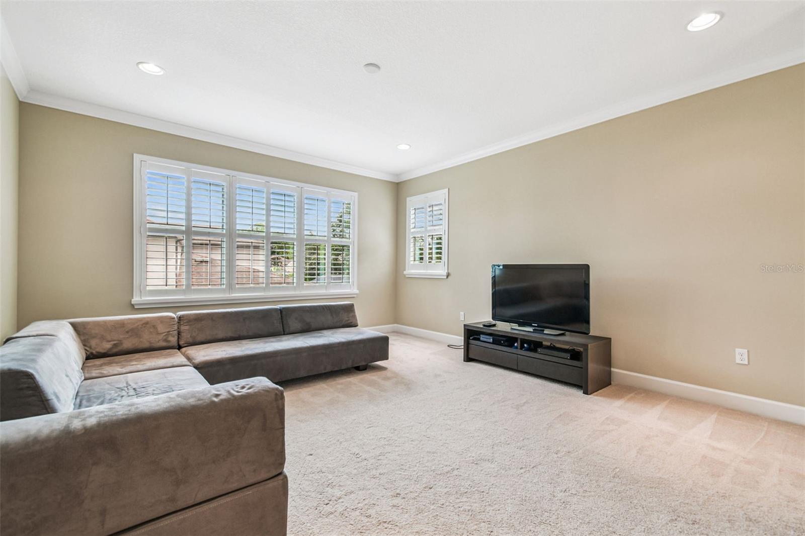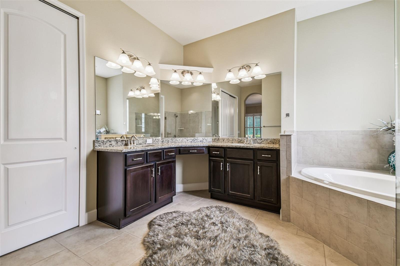 Seven Oaks. Gorgeous cul-de-sac home on magnificent conservation lot in gated Watermark, Seven Oaks most prestigious village. This 4 bedroom, 3 ½ bath, 3 car split garage residence also has a loft, theater room, bonus room and an oversized, covered and screened lanai. The soaring ceilings provide for a very open feeling. The large kitchen with an island has upgraded stainless steel appliances, eat in area, walk-in pantry, overlooking the huge family room. The oversized first floor primary suite has views of conservation, dual sinks, walk-in closet, shower and separate tub. The family room is open to the second floor providing an abundance of natural light, and has two oversized bedrooms, one with access to large balcony, a bath with double sinks, a loft, theater and large bonus room. This home has many upgrades, including but not limited to guest bedroom on first floor, extensive wood floors, extensive plantation shutters, upgraded tile, large dining room & living room combination, screened travertine lanai with a half bath, split garages, sprinkler system, alarm system, gutters, acrylic coated garage floors, and a stately entrance with a front porch.