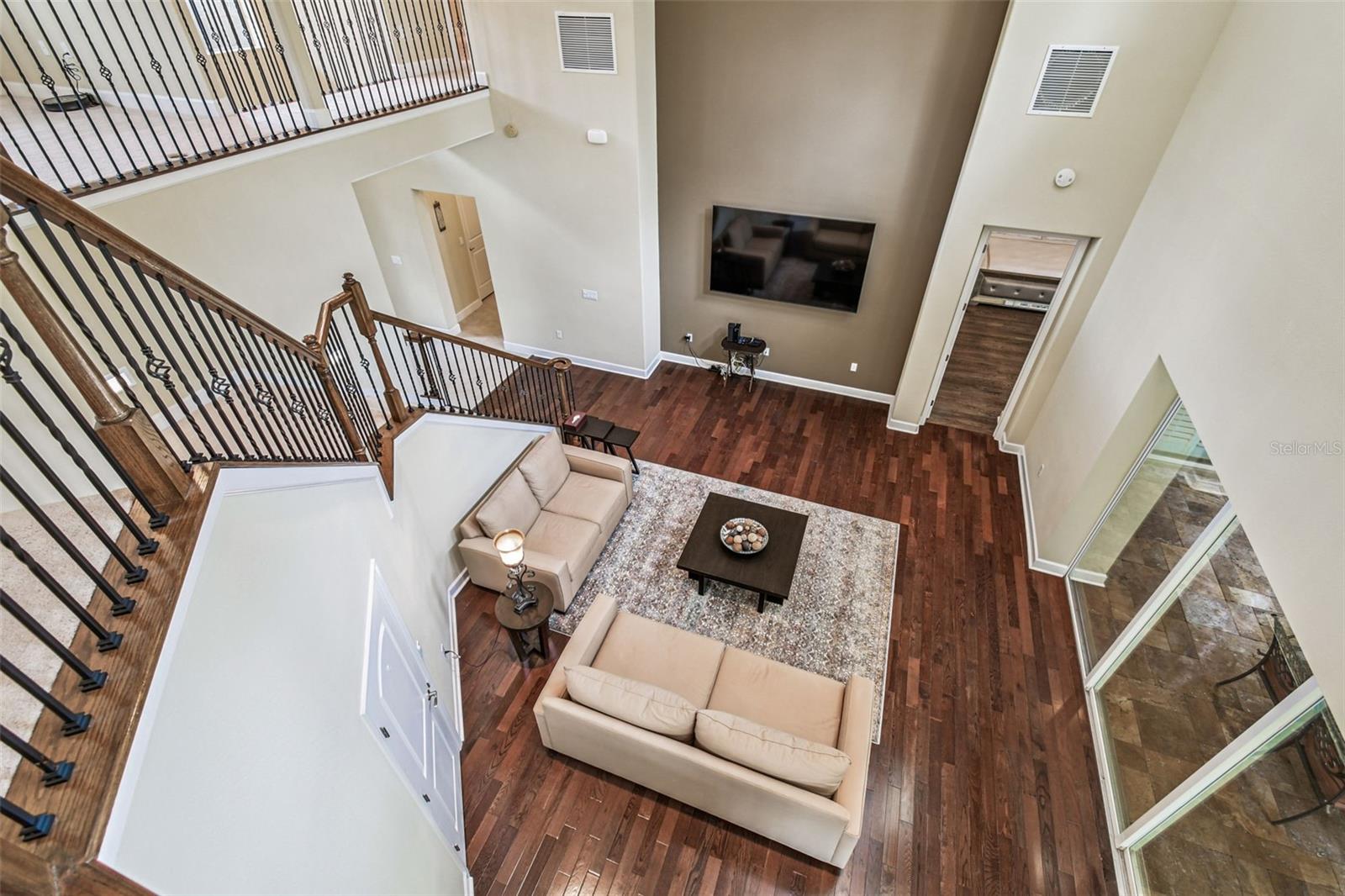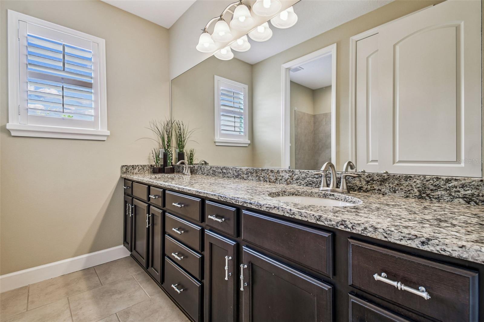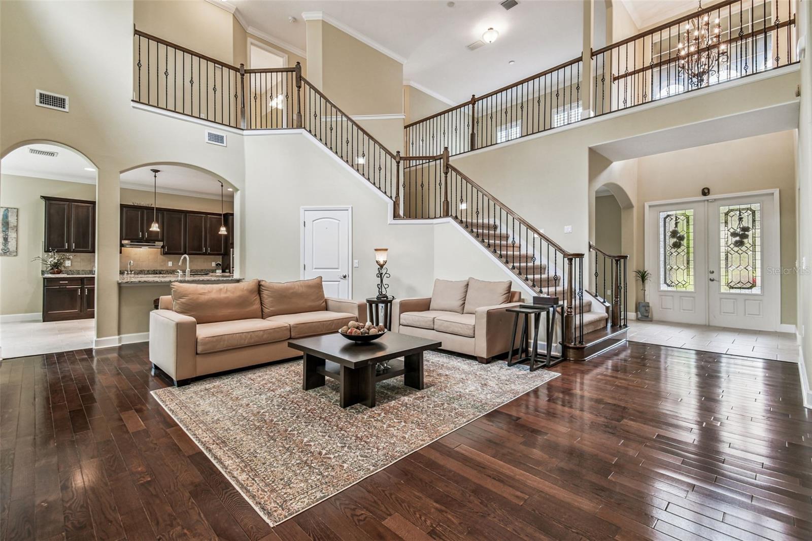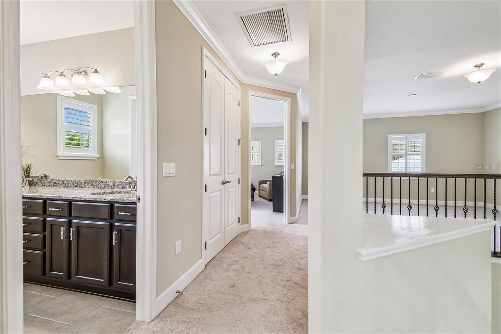 Seven Oaks. Gorgeous cul-de-sac home on magnificent conservation lot in gated Watermark, Seven Oaks most prestigious village. This 4 bedroom, 3 ½ bath, 3 car split garage residence also has a loft, theater room, bonus room and an oversized, covered and screened lanai. The soaring ceilings provide for a very open feeling. The large kitchen with an island has upgraded stainless steel appliances, eat in area, walk-in pantry, overlooking the huge family room. The oversized first floor primary suite has views of conservation, dual sinks, walk-in closet, shower and separate tub. The family room is open to the second floor providing an abundance of natural light, and has two oversized bedrooms, one with access to large balcony, a bath with double sinks, a loft, theater and large bonus room. This home has many upgrades, including but not limited to guest bedroom on first floor, extensive wood floors, extensive plantation shutters, upgraded tile, large dining room & living room combination, screened travertine lanai with a half bath, split garages, sprinkler system, alarm system, gutters, acrylic coated garage floors, and a stately entrance with a front porch.