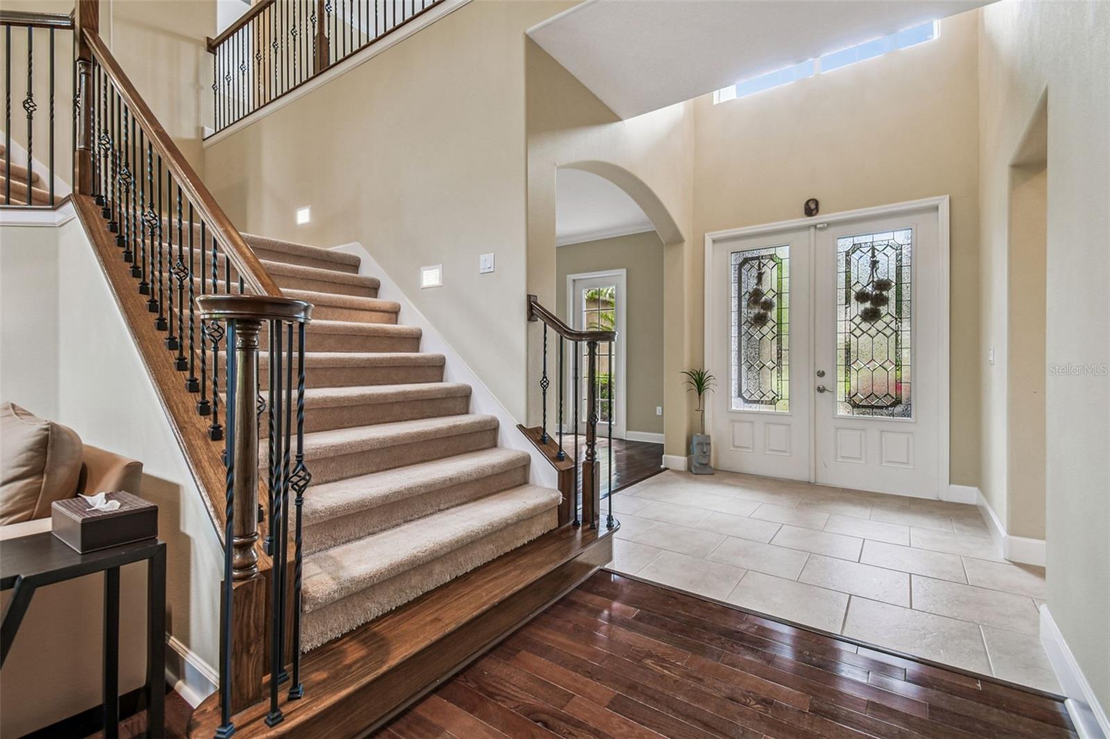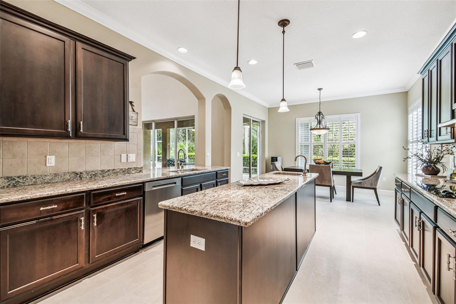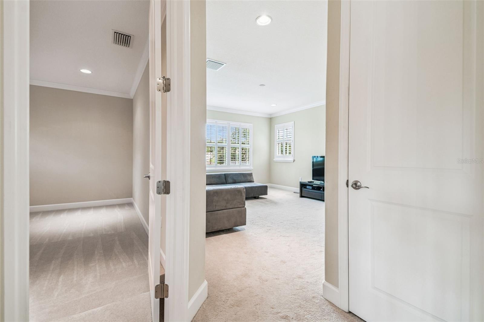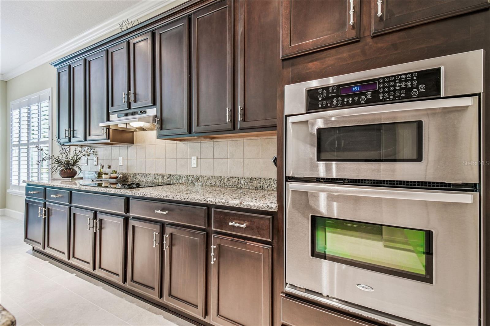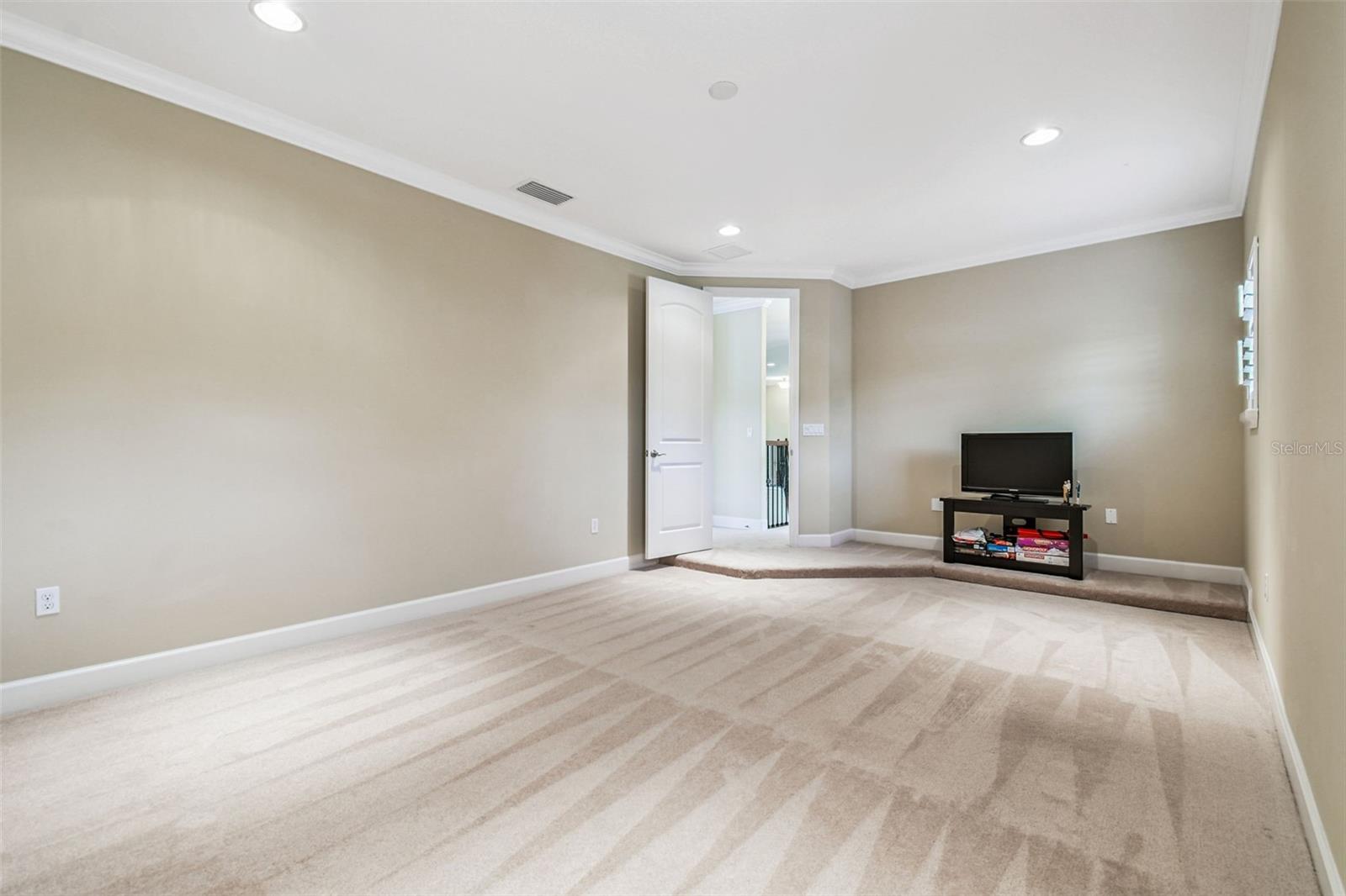 Seven Oaks. Gorgeous cul-de-sac home on magnificent conservation lot in gated Watermark, Seven Oaks most prestigious village. This 4 bedroom, 3 ½ bath, 3 car split garage residence also has a loft, theater room, bonus room and an oversized, covered and screened lanai. The soaring ceilings provide for a very open feeling. The large kitchen with an island has upgraded stainless steel appliances, eat in area, walk-in pantry, overlooking the huge family room. The oversized first floor primary suite has views of conservation, dual sinks, walk-in closet, shower and separate tub. The family room is open to the second floor providing an abundance of natural light, and has two oversized bedrooms, one with access to large balcony, a bath with double sinks, a loft, theater and large bonus room. This home has many upgrades, including but not limited to guest bedroom on first floor, extensive wood floors, extensive plantation shutters, upgraded tile, large dining room & living room combination, screened travertine lanai with a half bath, split garages, sprinkler system, alarm system, gutters, acrylic coated garage floors, and a stately entrance with a front porch.