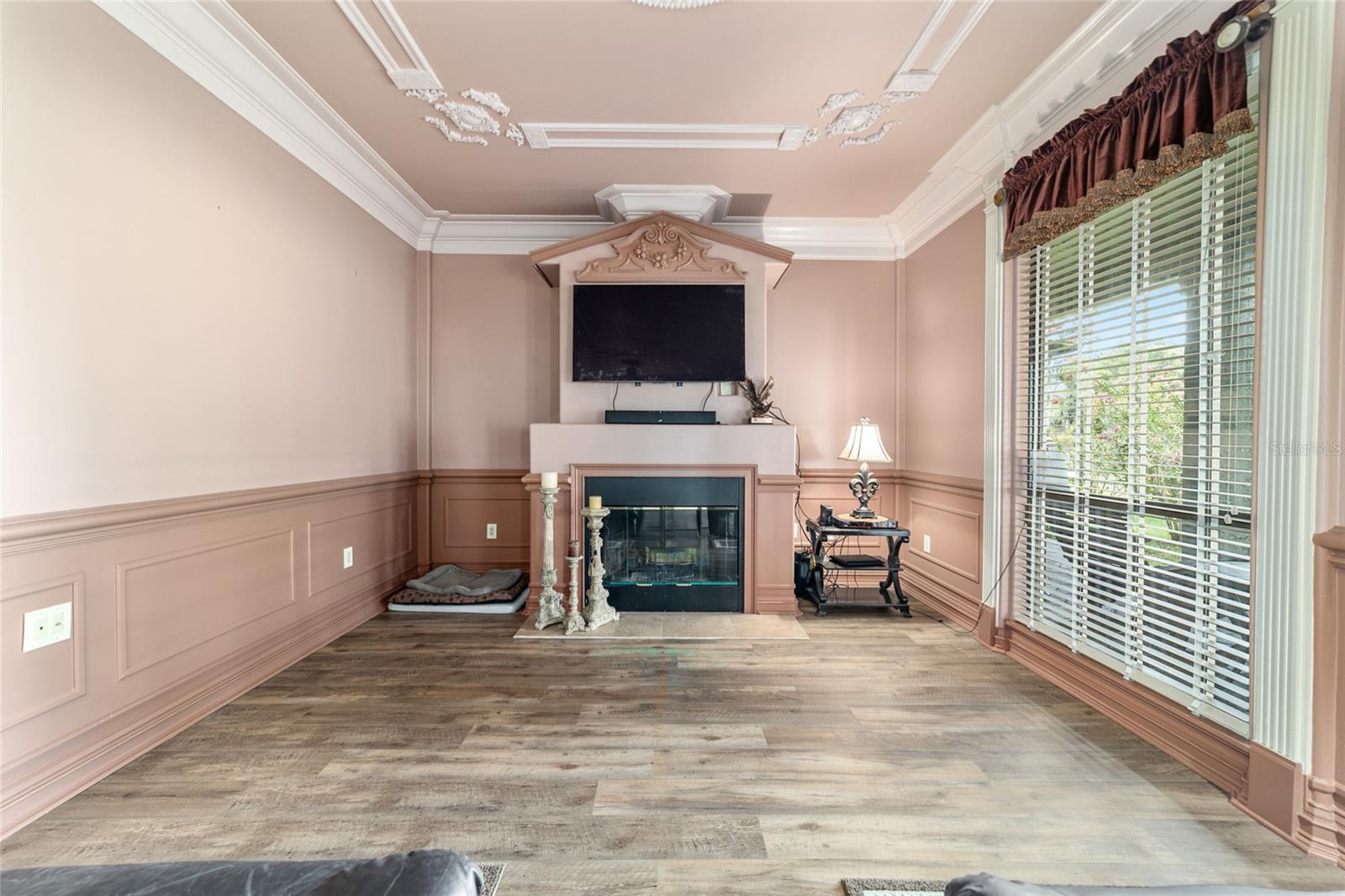Inside, the heart of the home is a chef’s kitchen designed for entertaining, with exquisite granite countertops, high-end cabinetry, a spacious island with seating and storage, designer tilework, and a built-in desk nook for seamless everyday functionality. Adjacent living spaces feature rich wood floors, a fireplace, French doors, and elegant architectural details that create a warm yet elevated ambiance. The wraparound veranda offers a tranquil setting for morning coffee, sunset cocktails, or hosting al fresco dinners with views of green pastures and grazing horses.