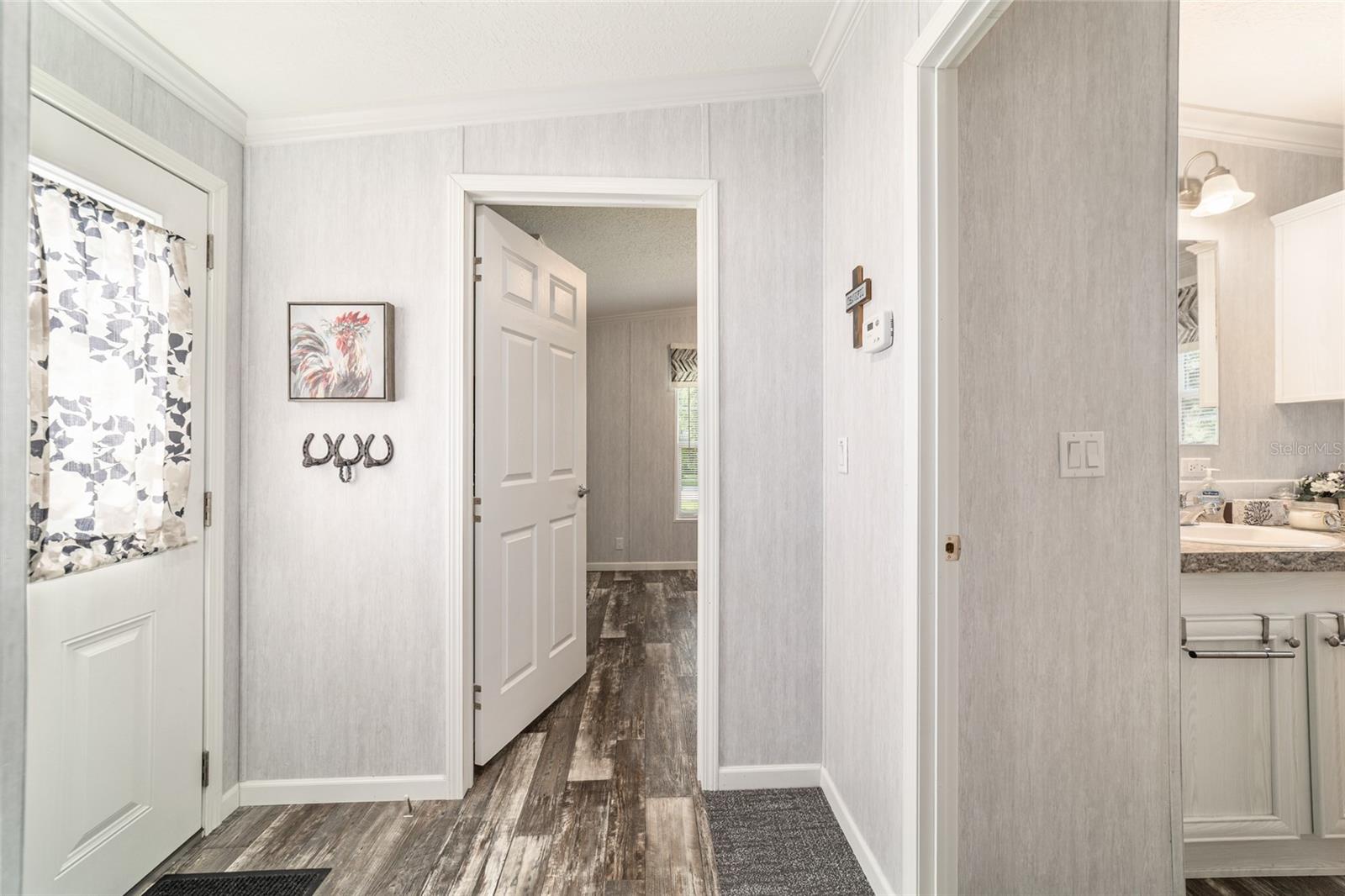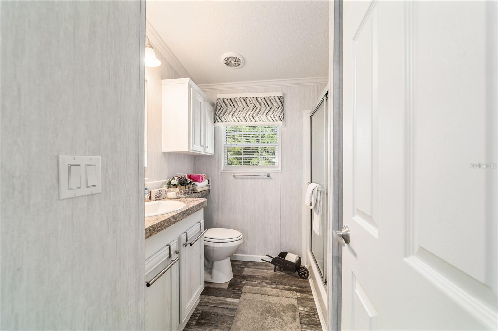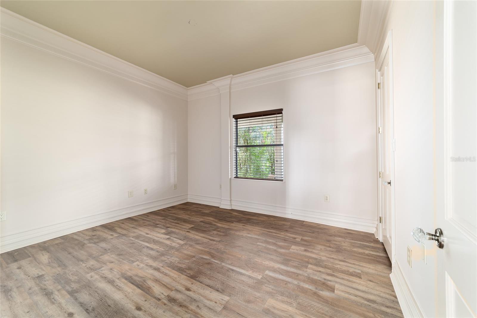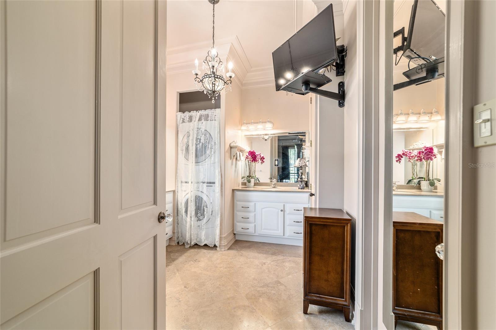 The private master suite is a sanctuary of comfort and luxury, complete with tray ceiling, crown molding, a generous walk-in closet, and spa-inspired en-suite bath featuring a jetted tub, glass-enclosed shower, dual vanities, bidet, and dedicated laundry hookups for added convenience. Two additional bedrooms, each with lighted walk-in closets and serene views, share a beautifully tiled full bath.