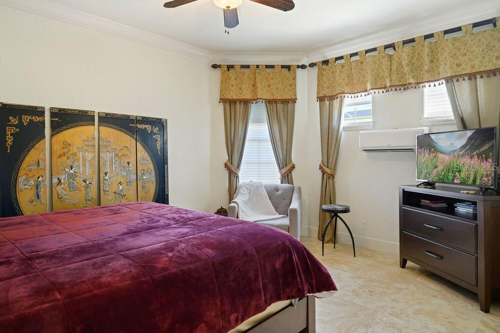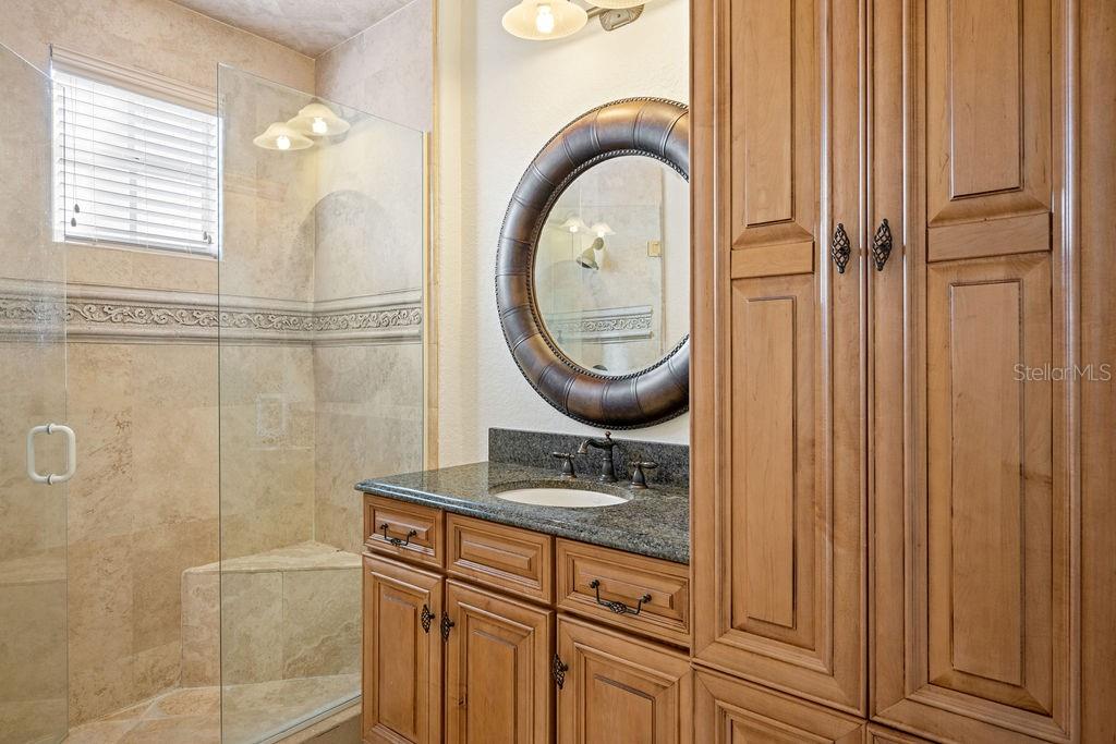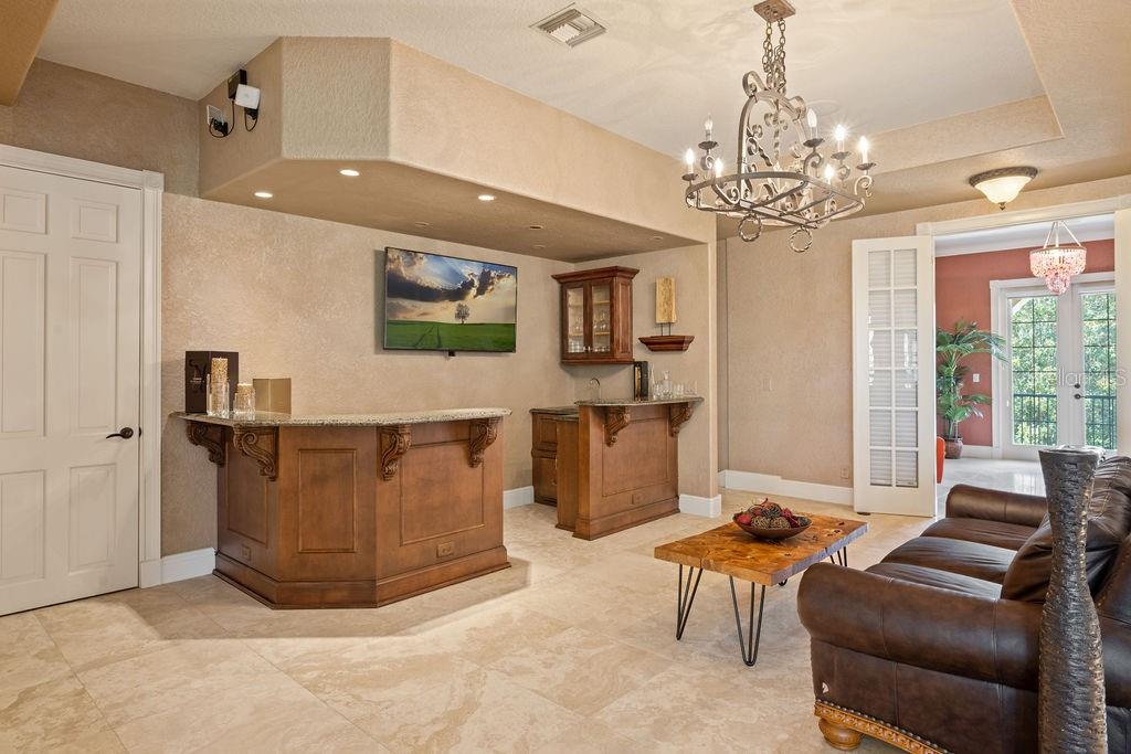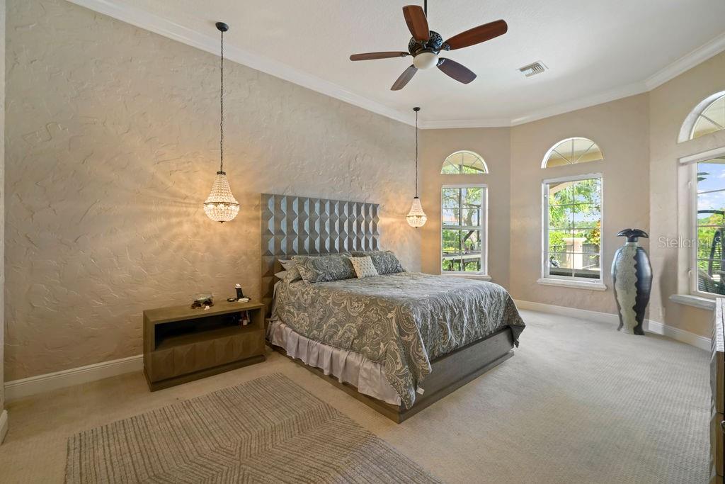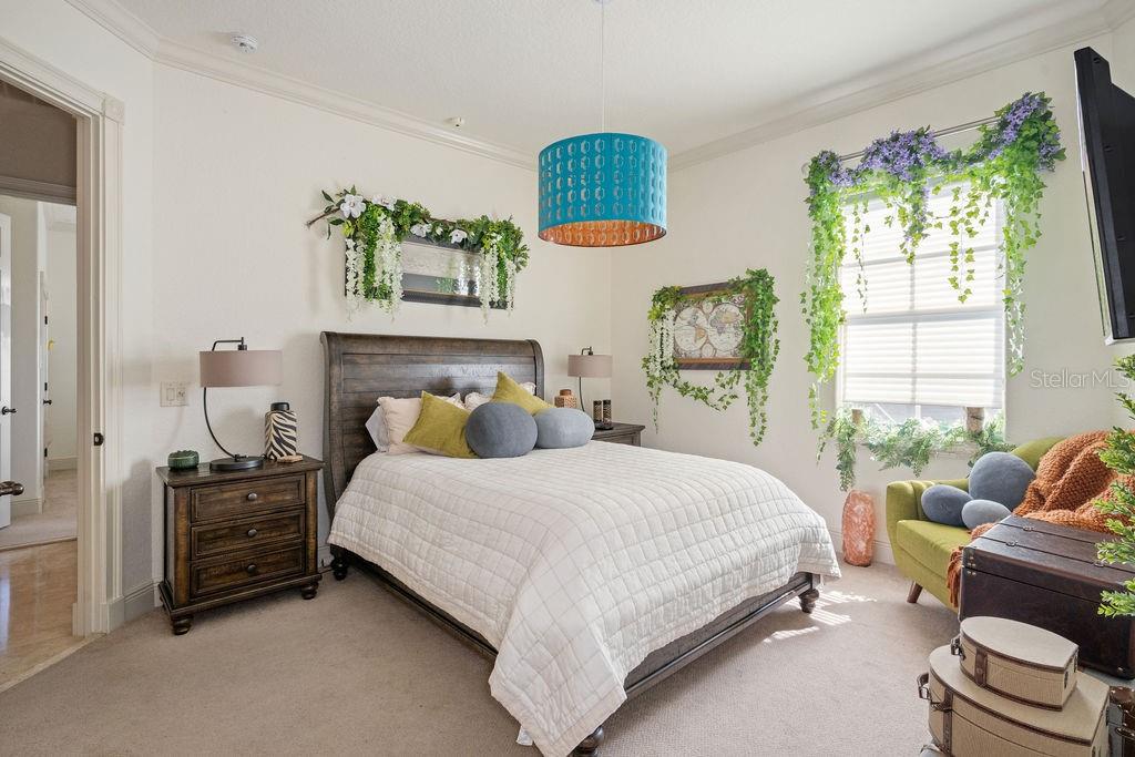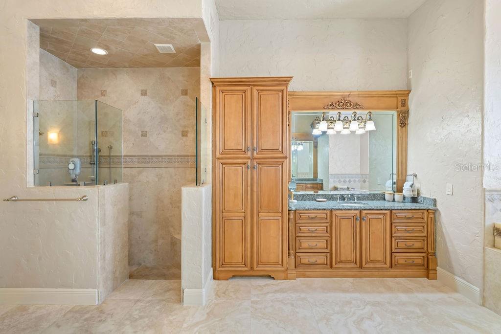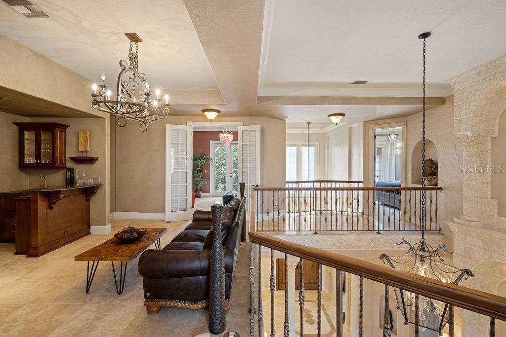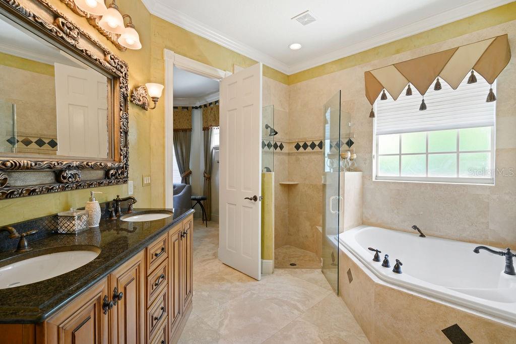 From the moment you step through the grand double doors, you’re welcomed by travertine flooring, elegant architectural detail, and a sense of scale that is both impressive and inviting. The main-level primary suite is an expansive retreat featuring dual walk-in closets and an unforgettable two-story spa bath designed to inspire relaxation. A second bedroom suite on the first floor provides ideal accommodations for guests or multi-generational living.